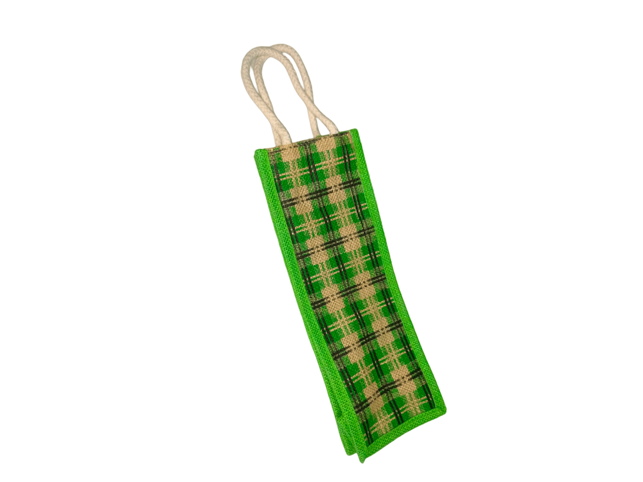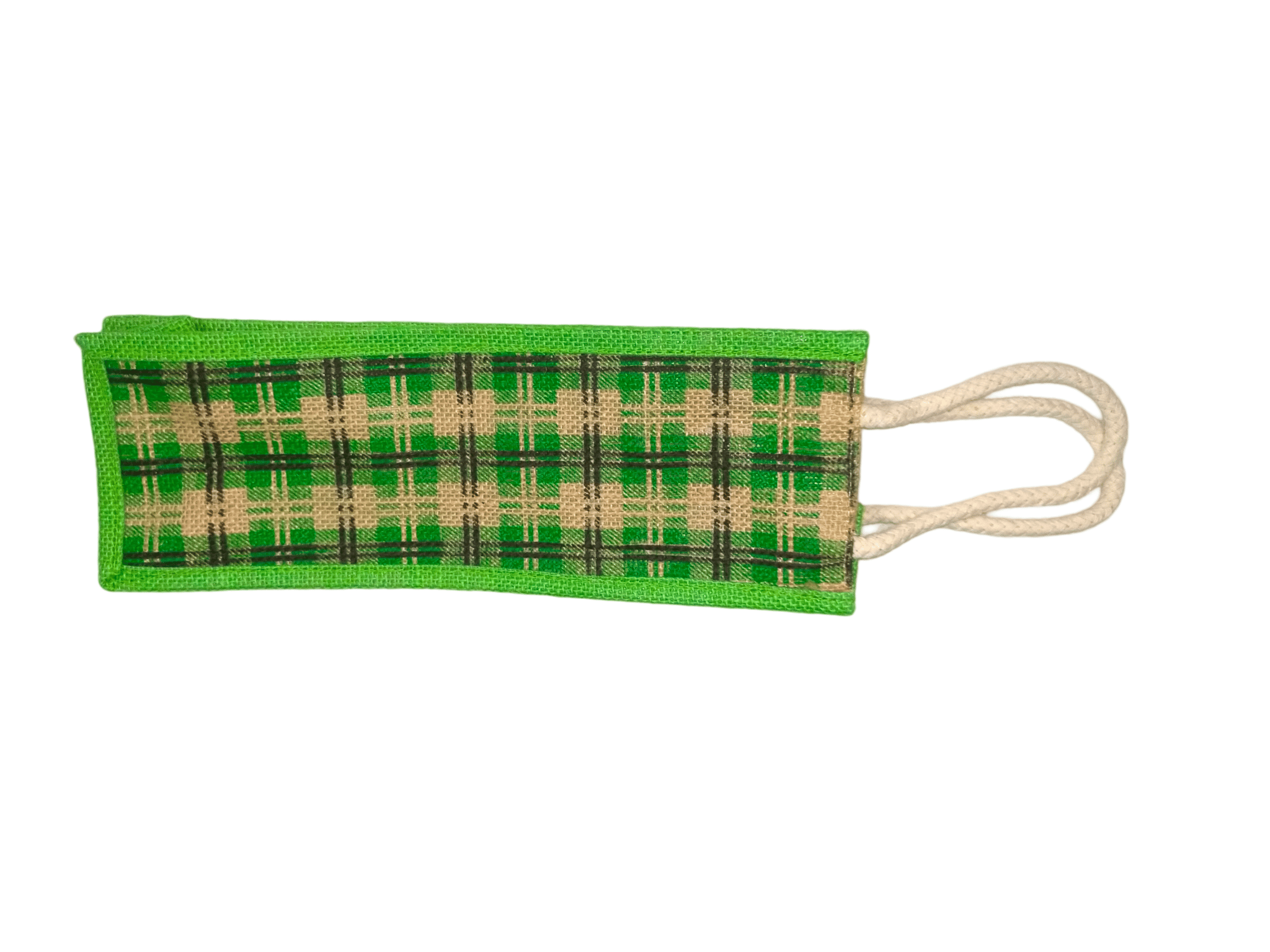 A cute green burlap gift bag with a checkered design, perfect for gifting or storage.