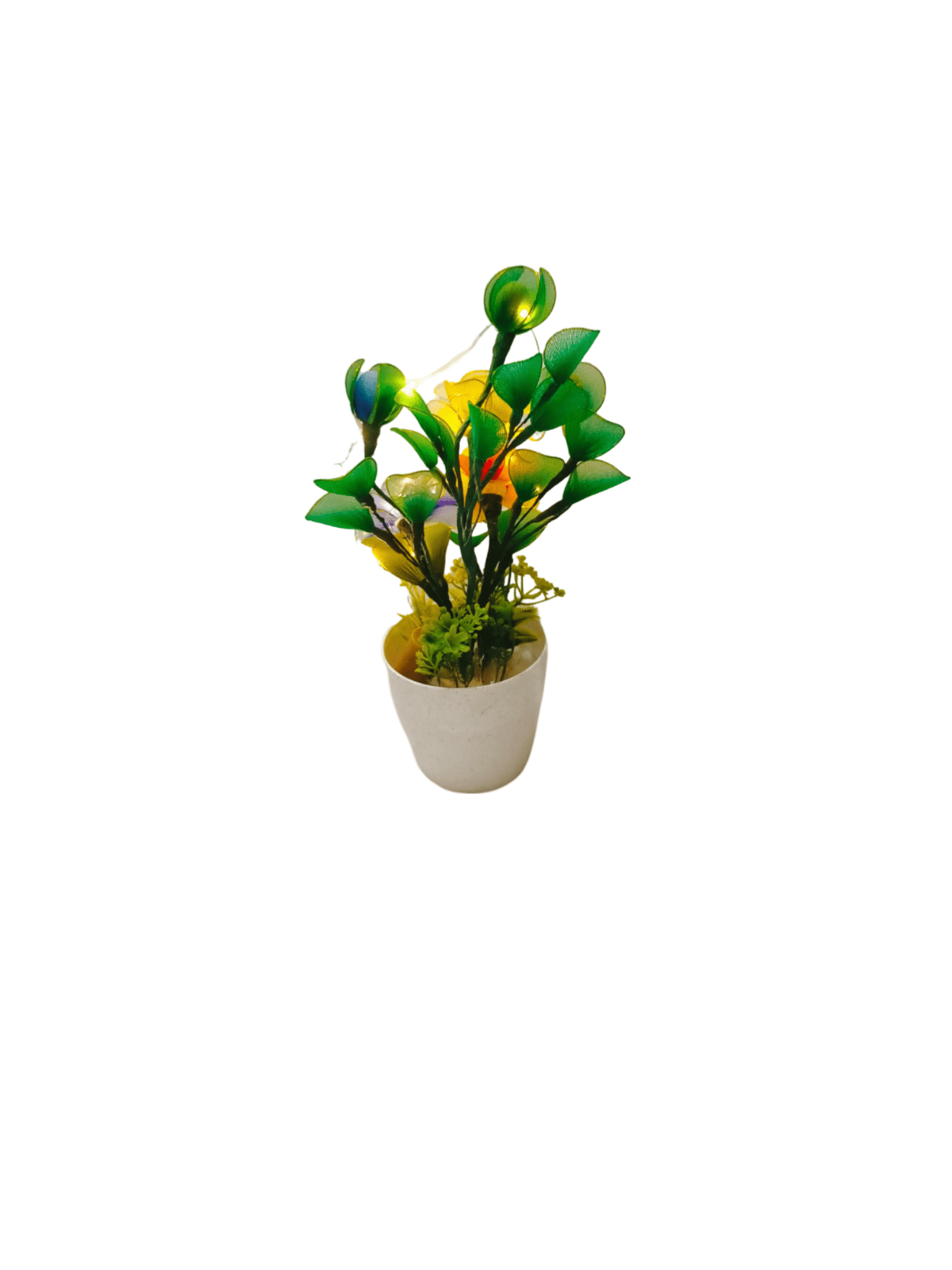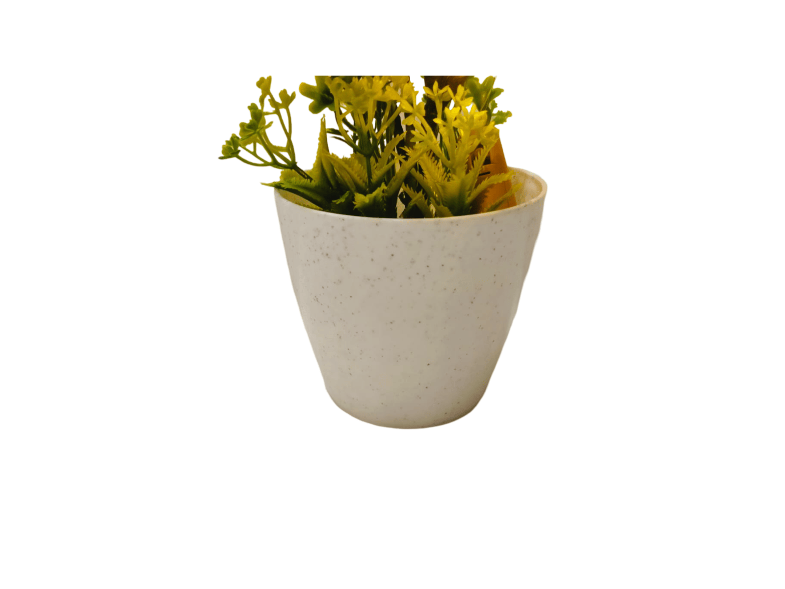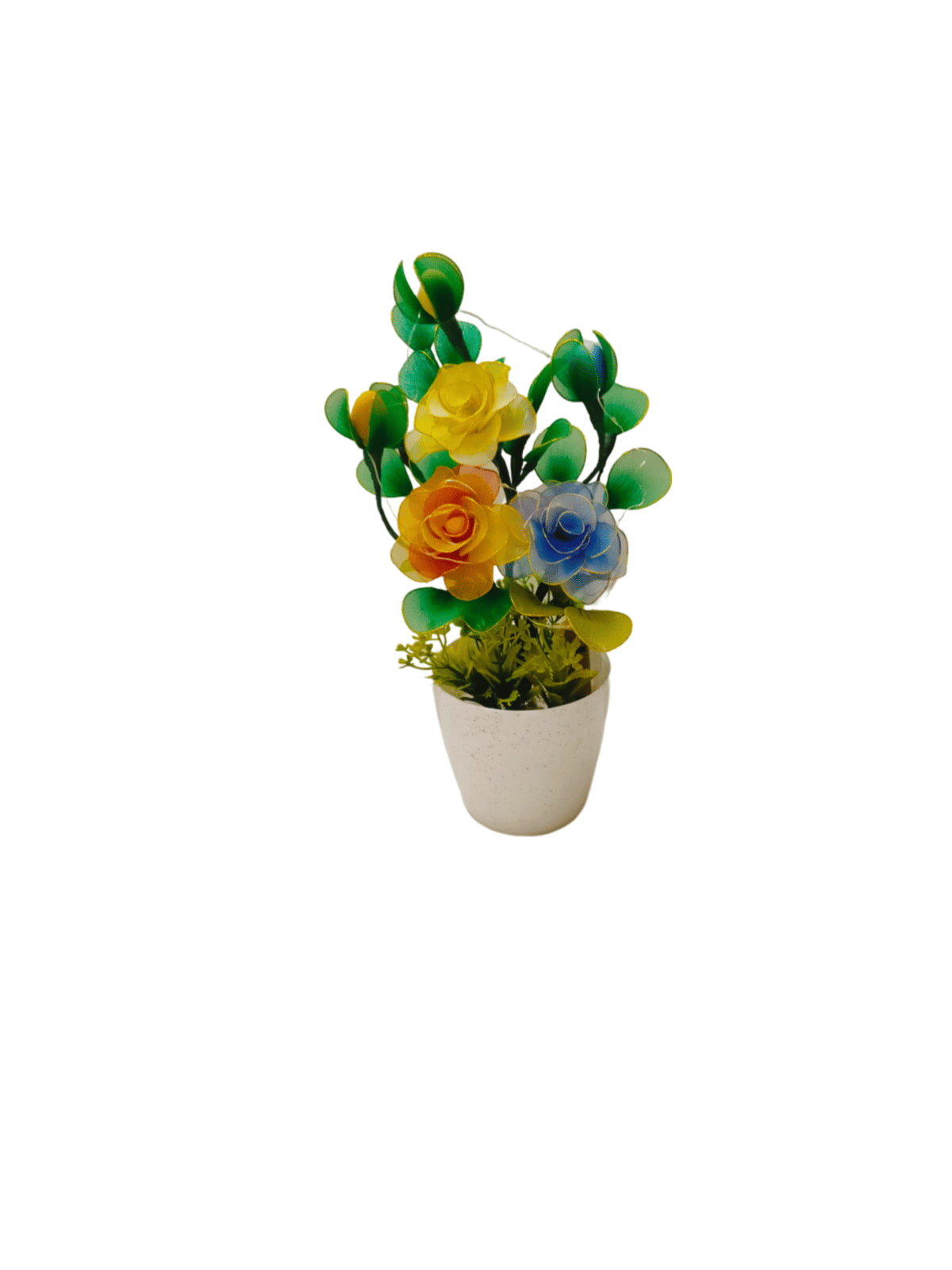 Handmade white pot with three multicolor rose flowers, ideal for home décor.