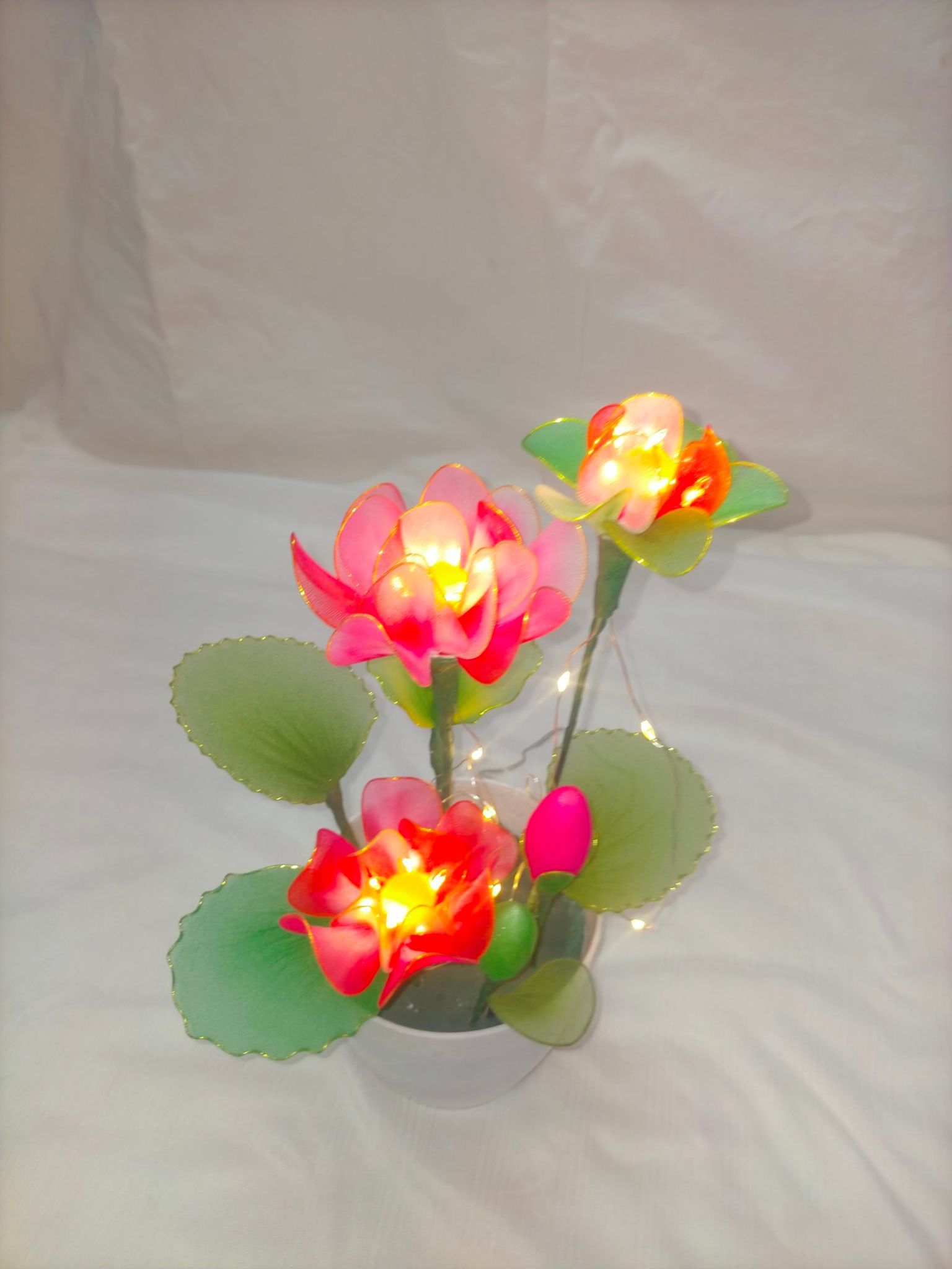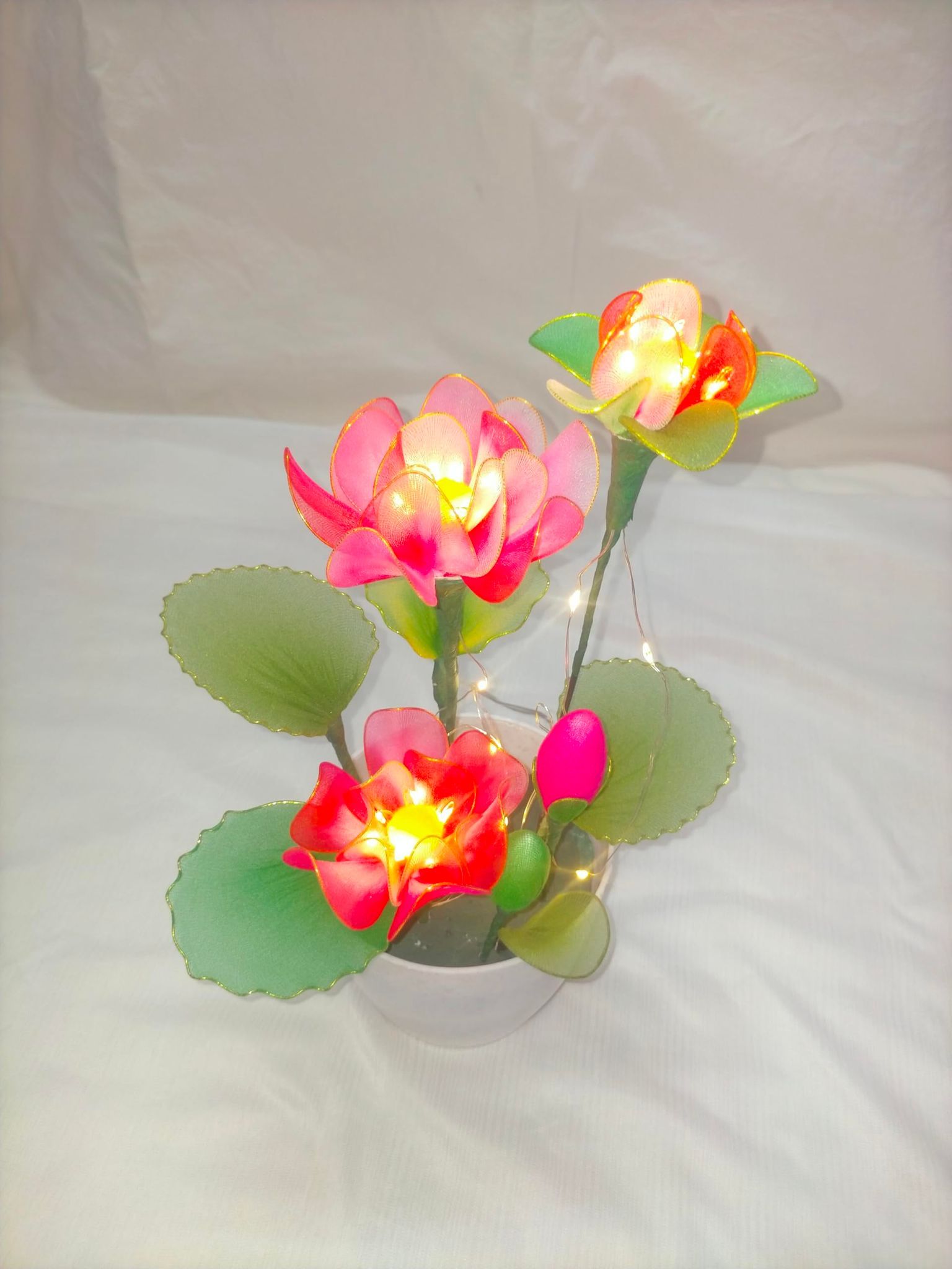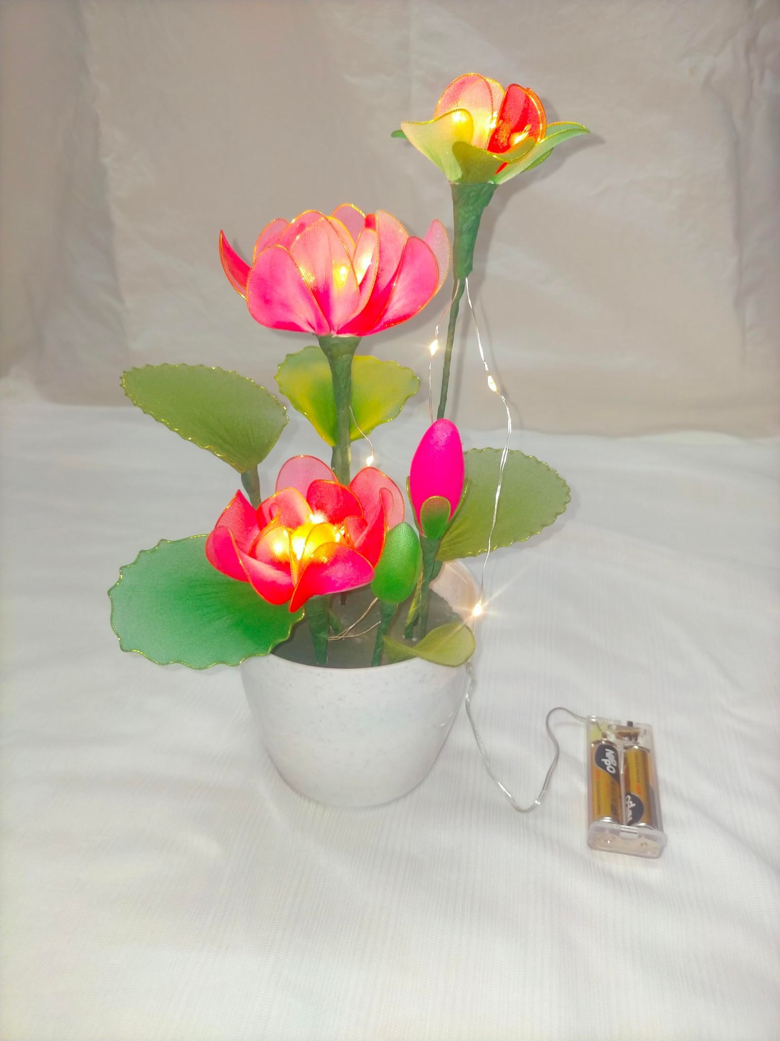 Handmade stocking flowers in a white pot, adding a pop of color to any space.