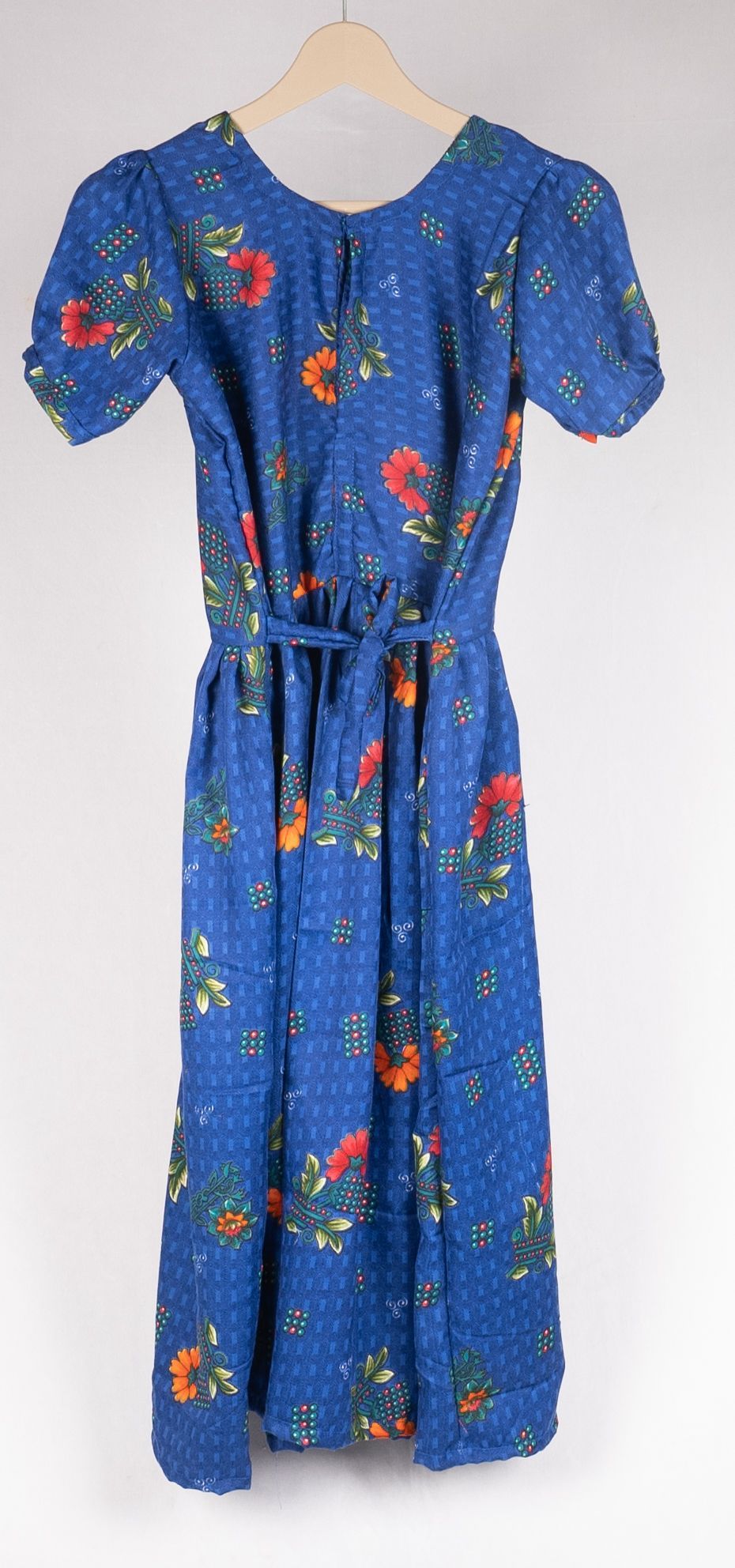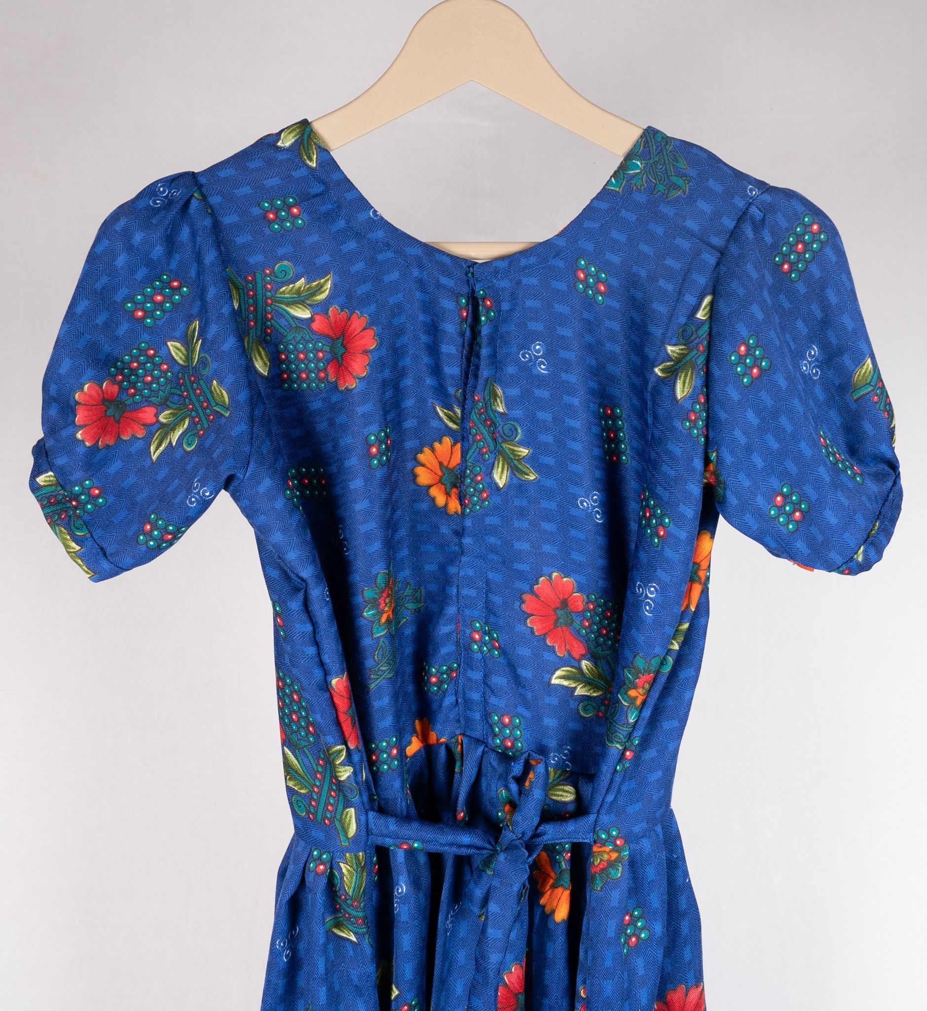 Blue Floral Print A-Line Dress with Square Neck and Short Sleeves