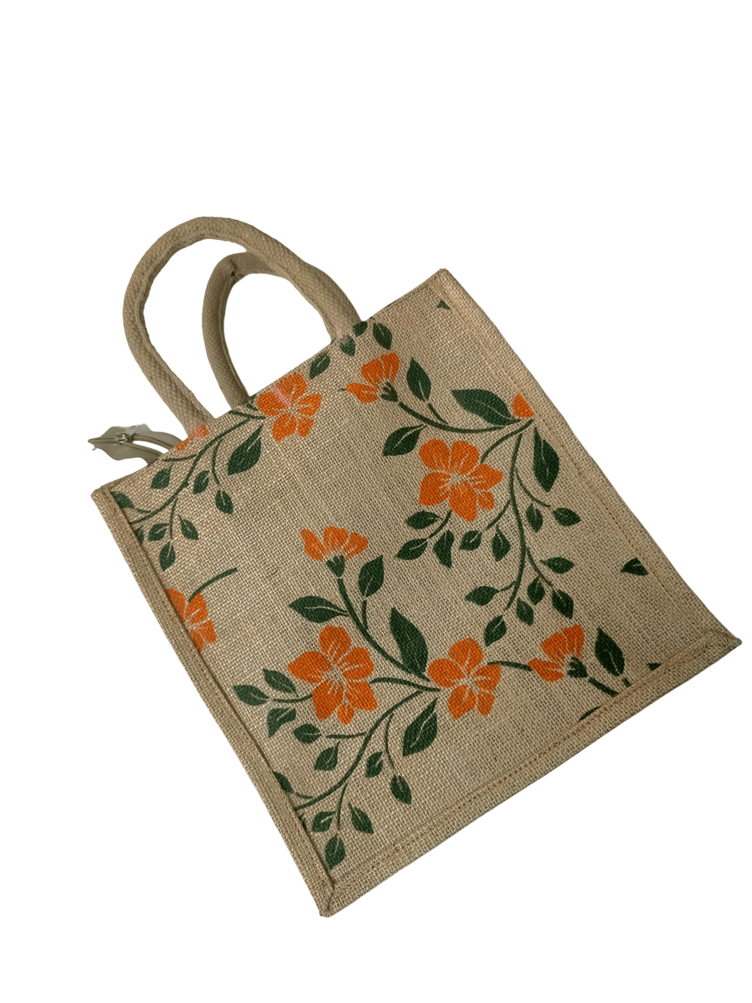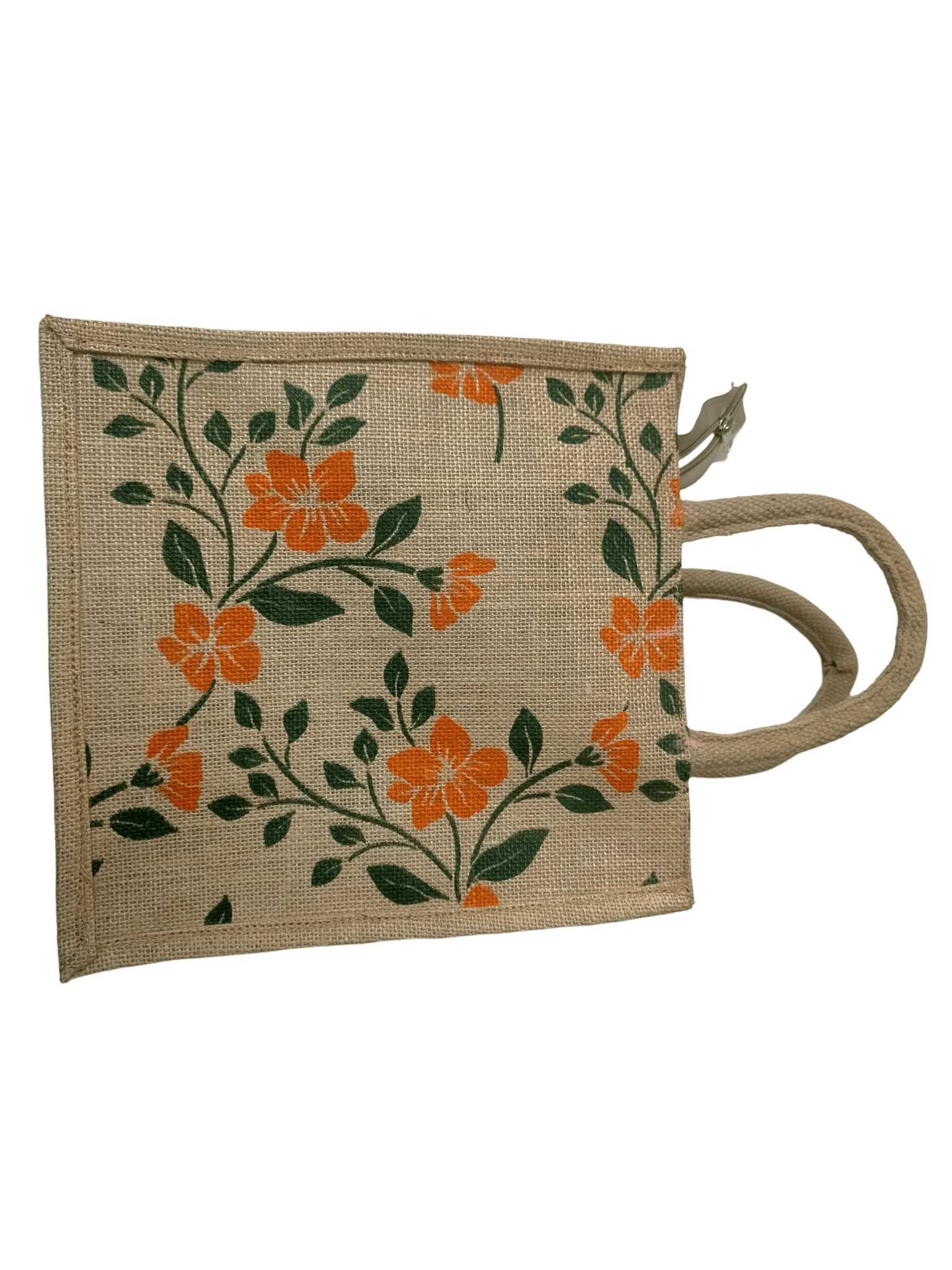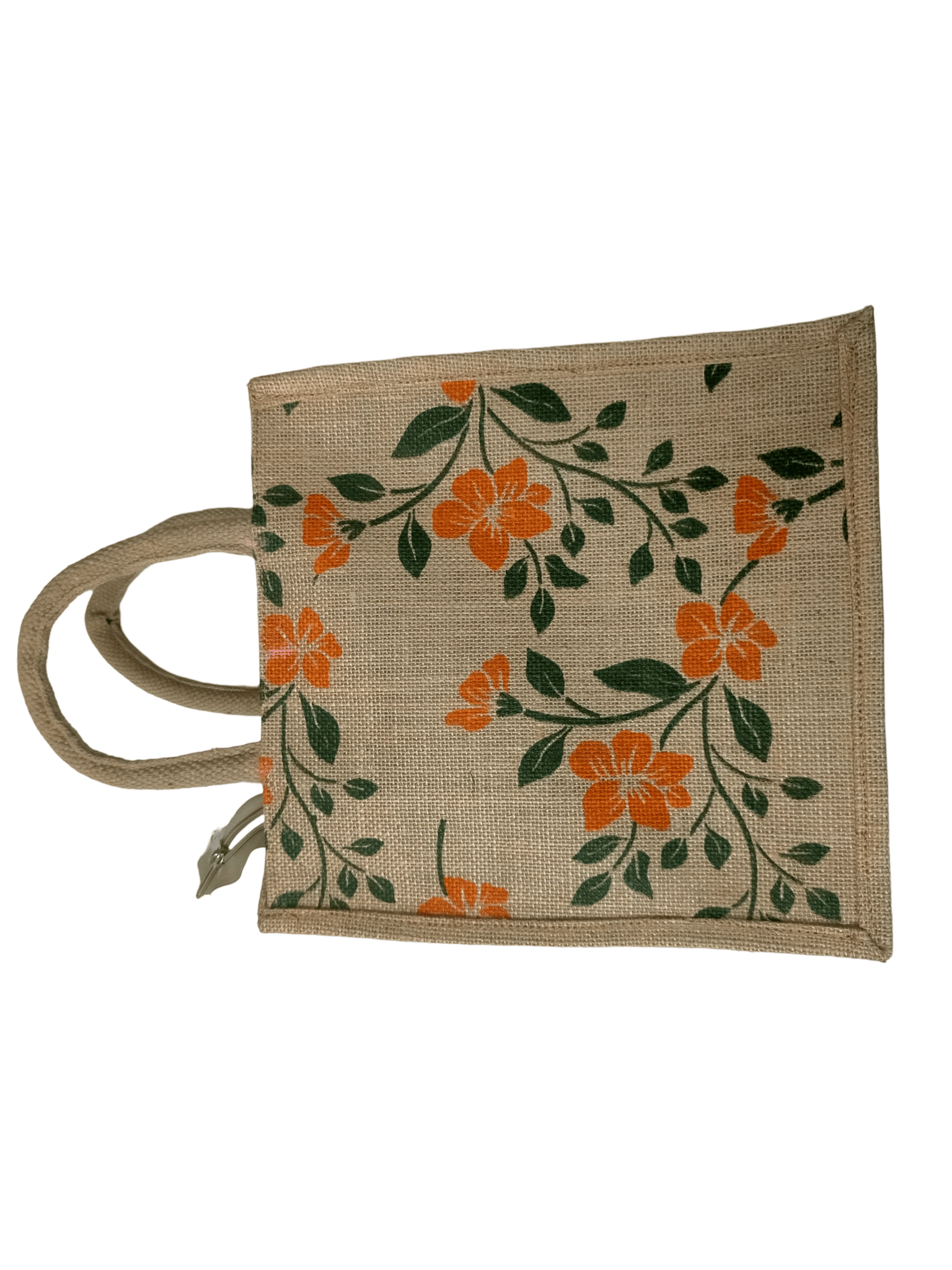 A handy and eco-friendly jute lunch bag with a zipper and sturdy handles. Great for daily use.