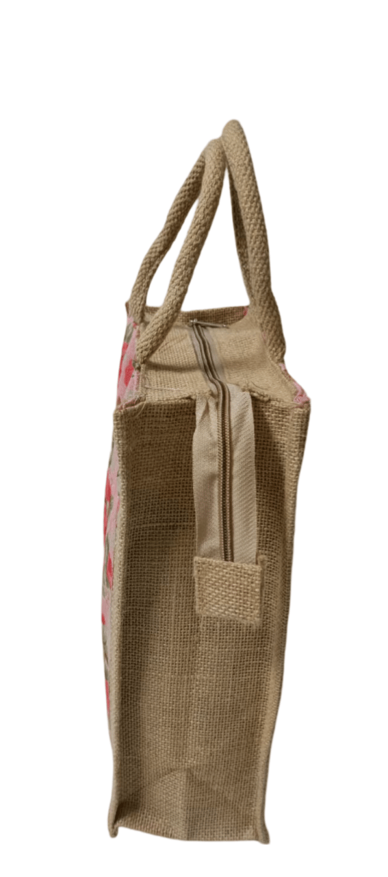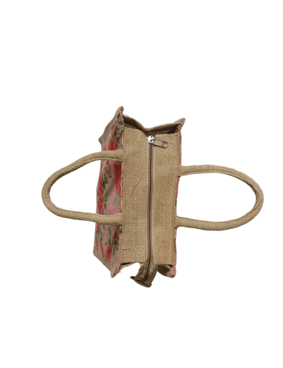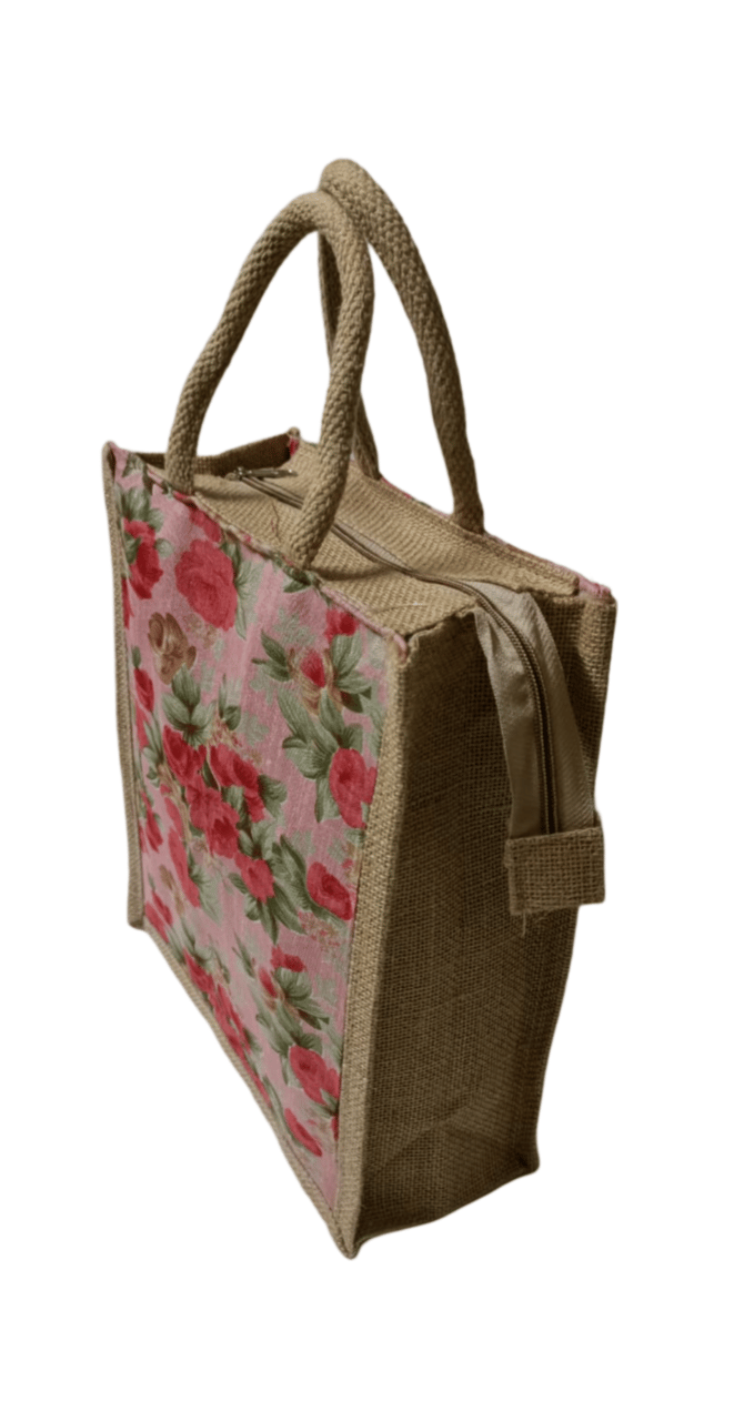 A cute and compact jute tote bag with a floral print and zip closure. Ideal for daily essentials.
