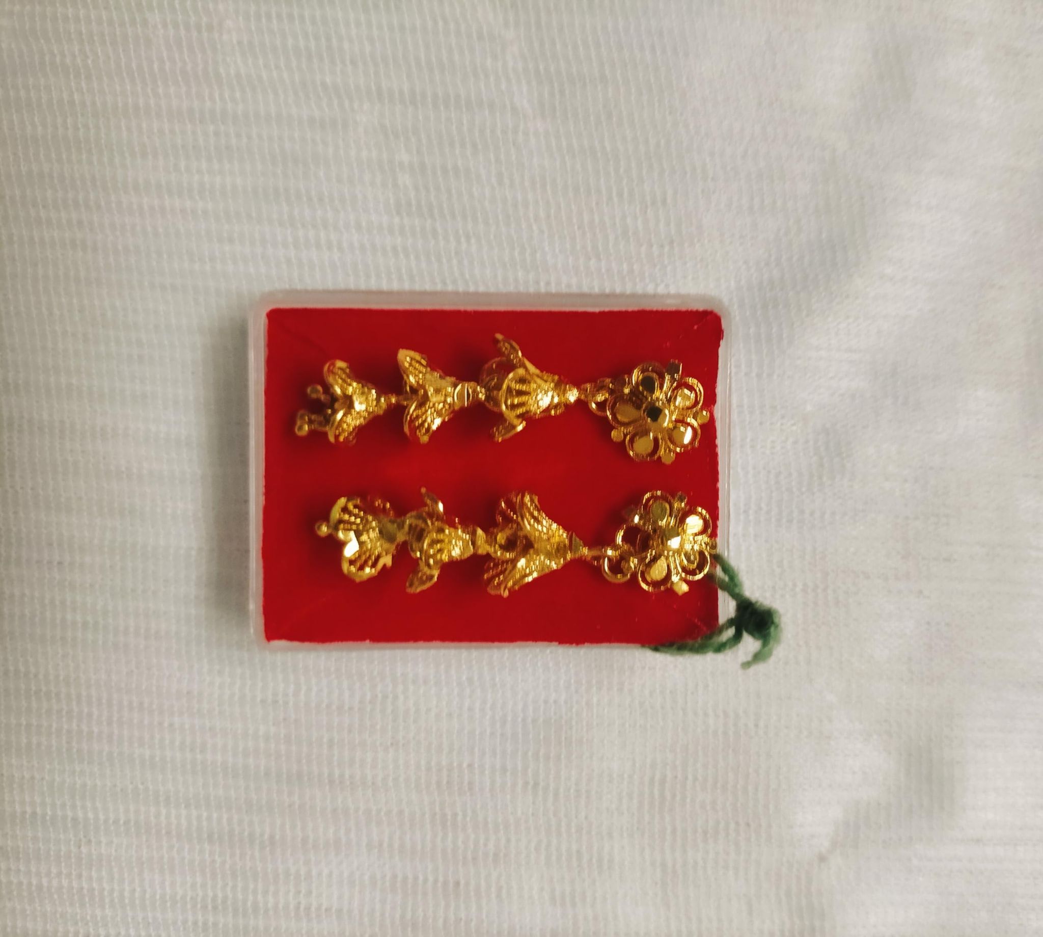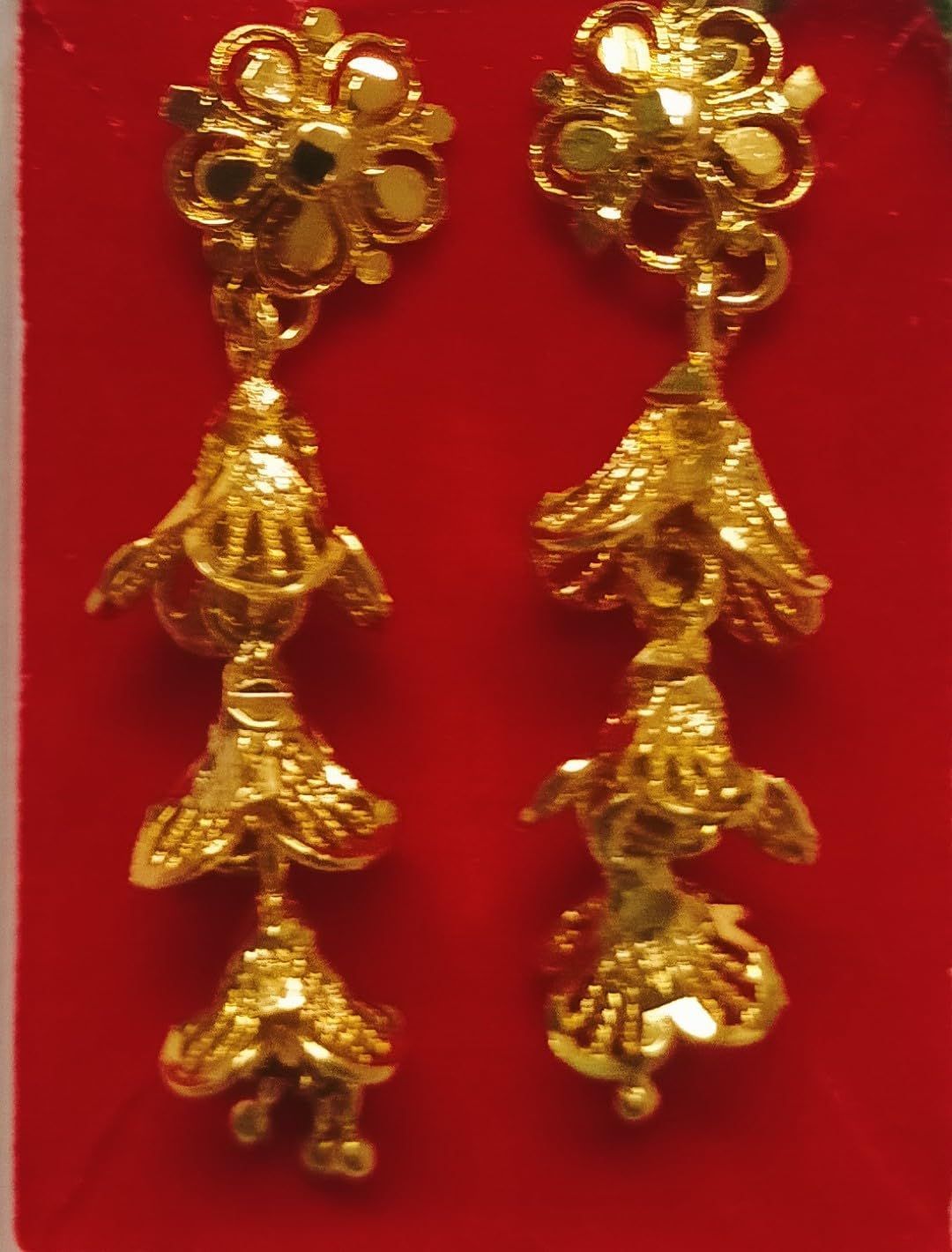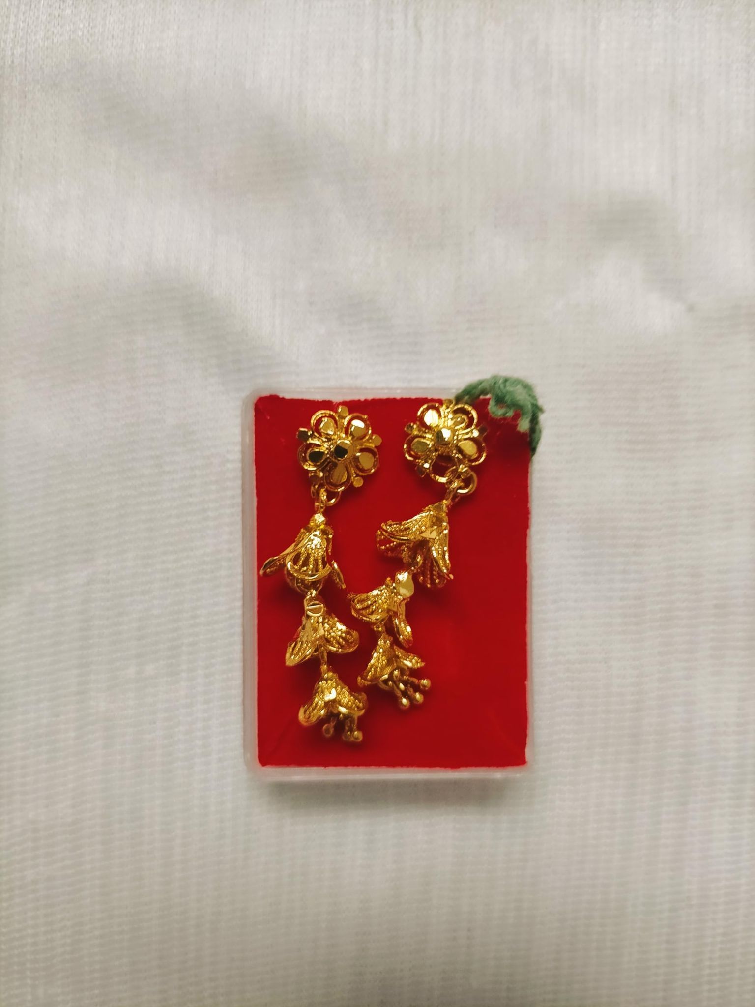Stylish and elegant three-step Jhumki earrings with intricate detailing. Perfect for festive occasions and traditional outfits