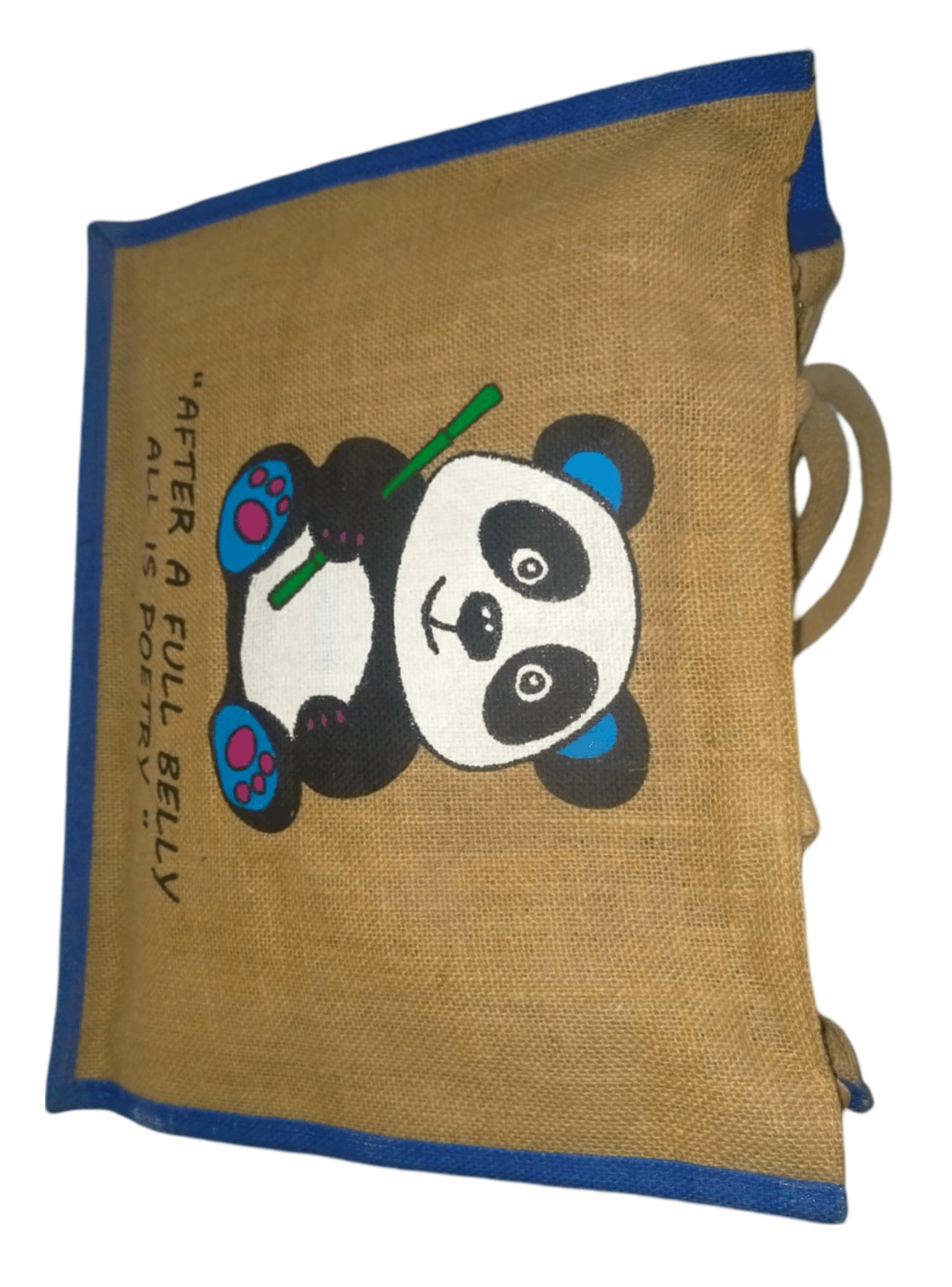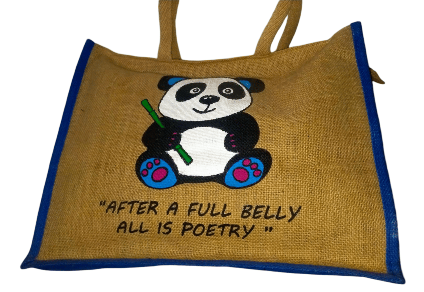 A cute jute tote bag with a hand-painted panda design.