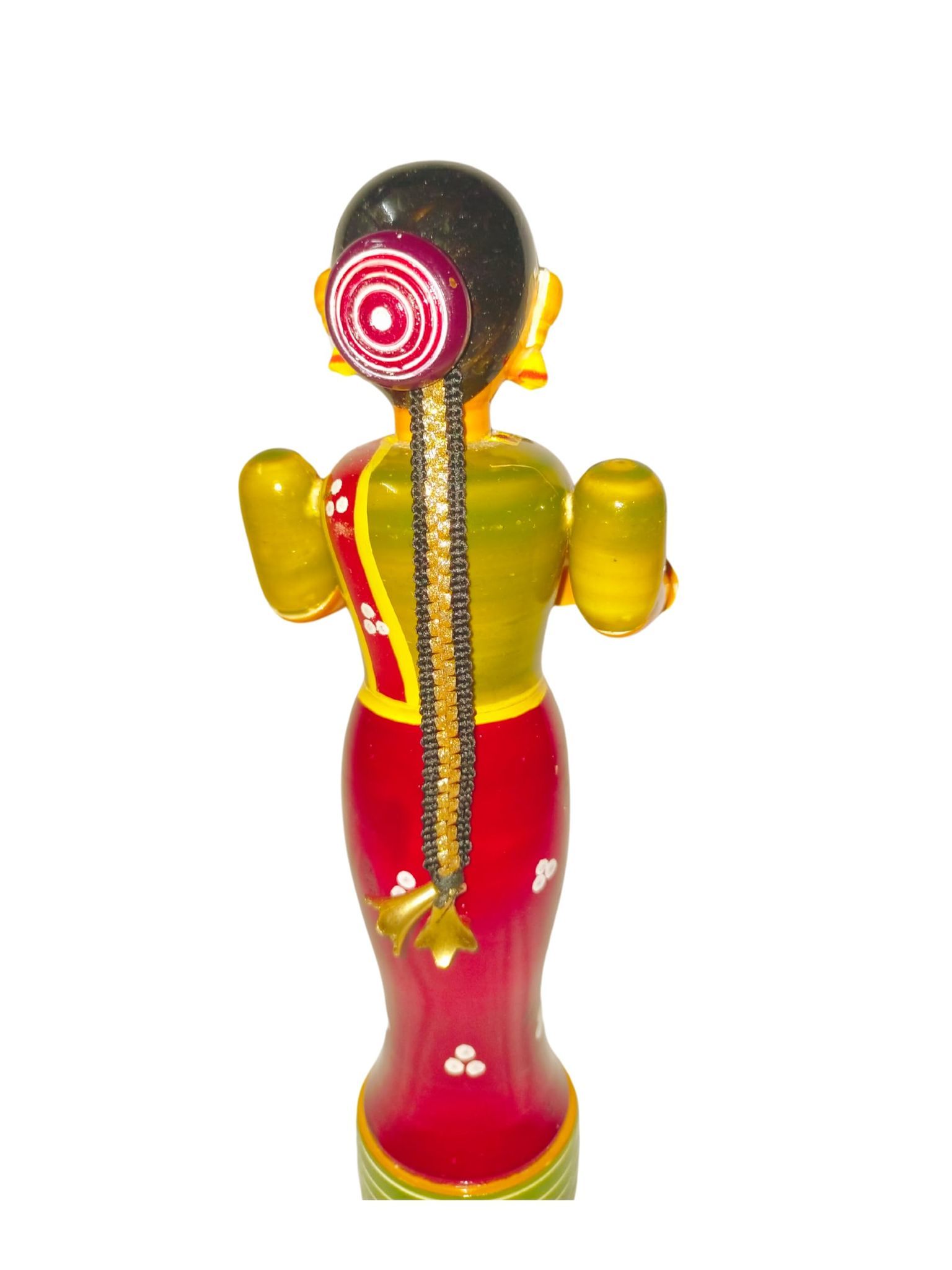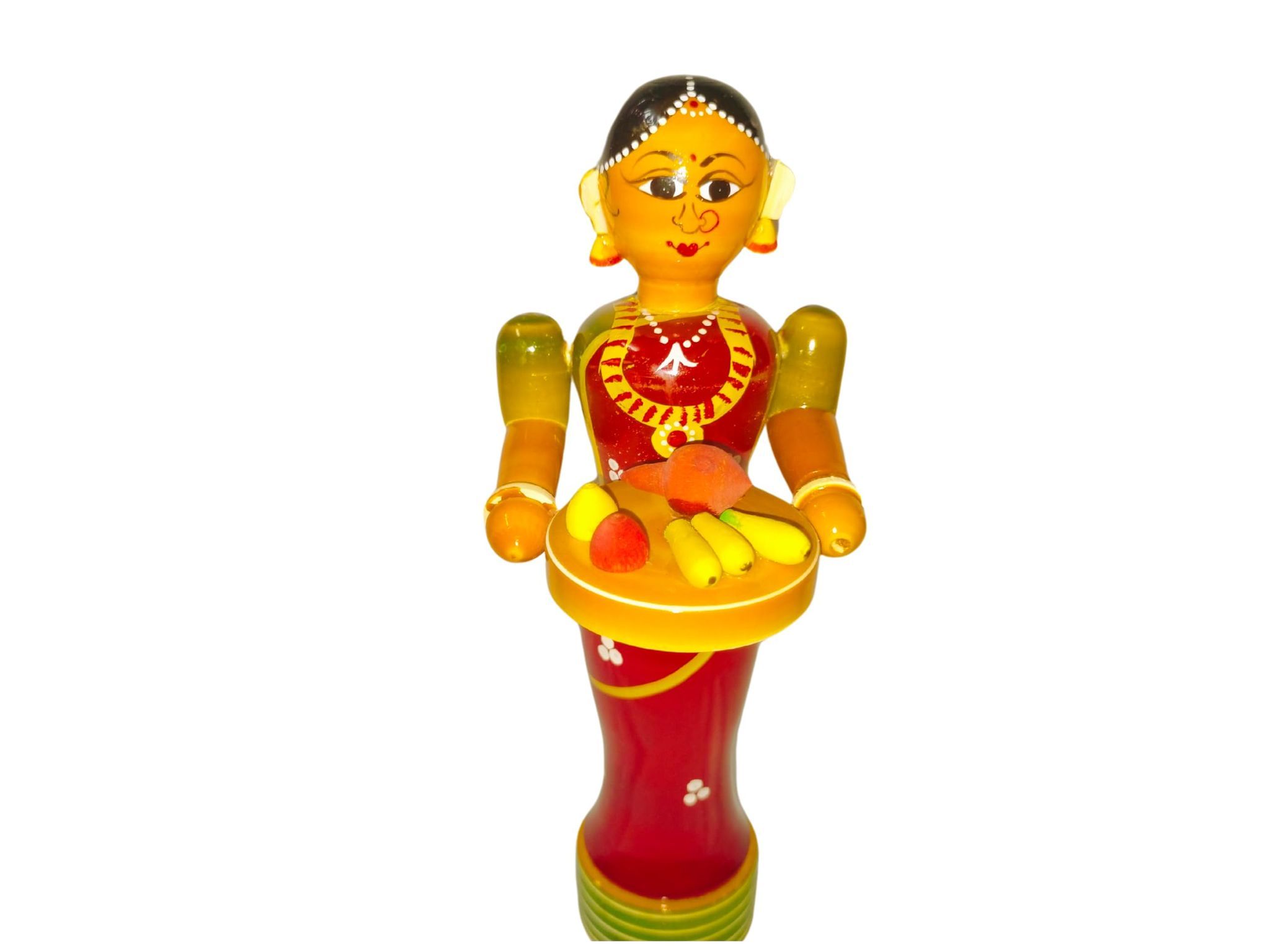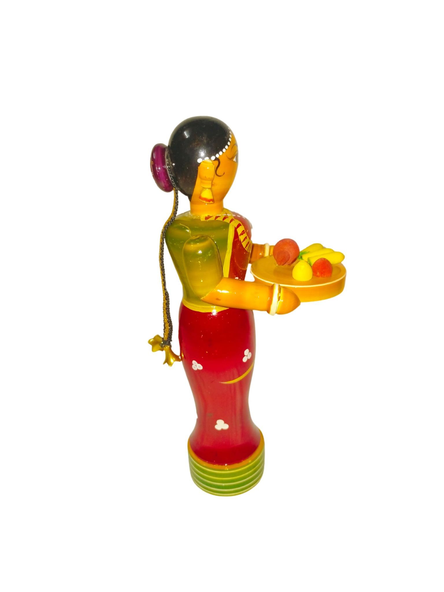 A handcrafted wooden lady figurine with pots, a charming decor piece.