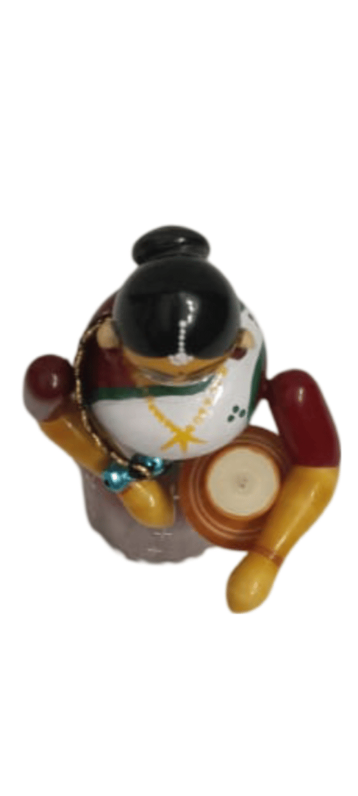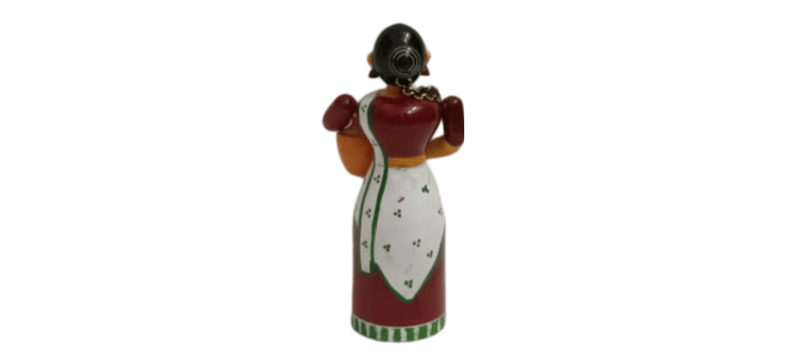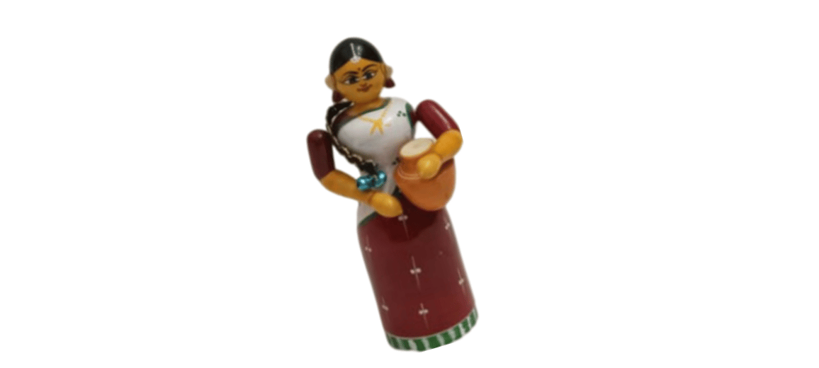 A handcrafted wooden figurine of a traditional Indian lady with a pot.