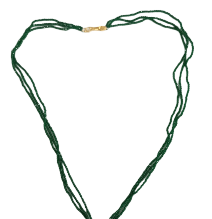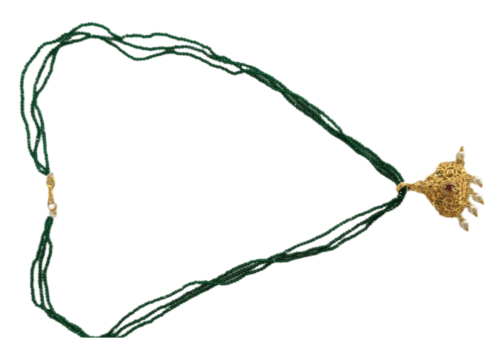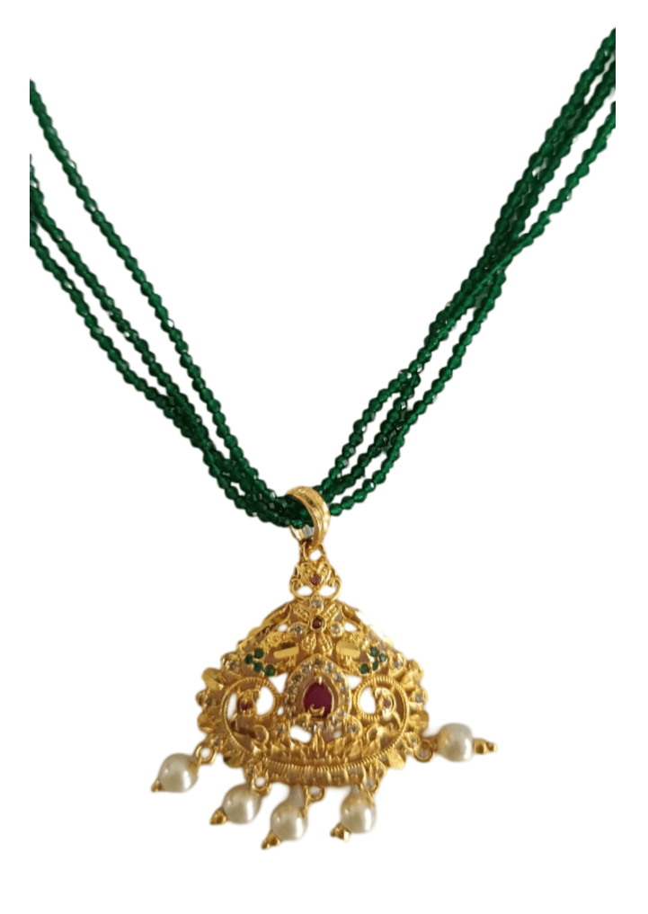 A traditional Indian temple-style necklace set with gold plating and green beads.