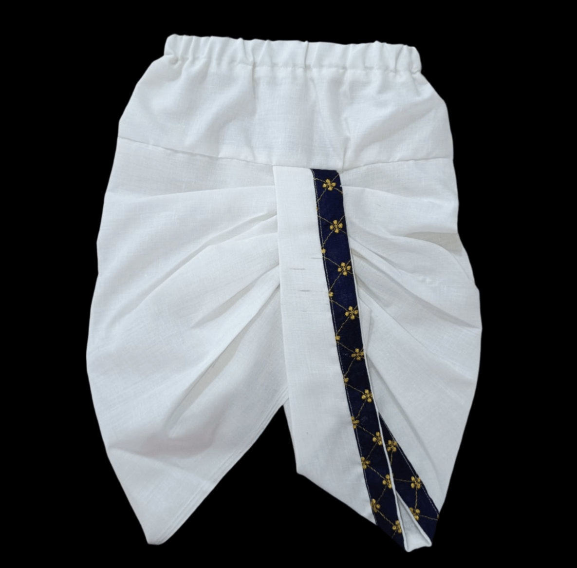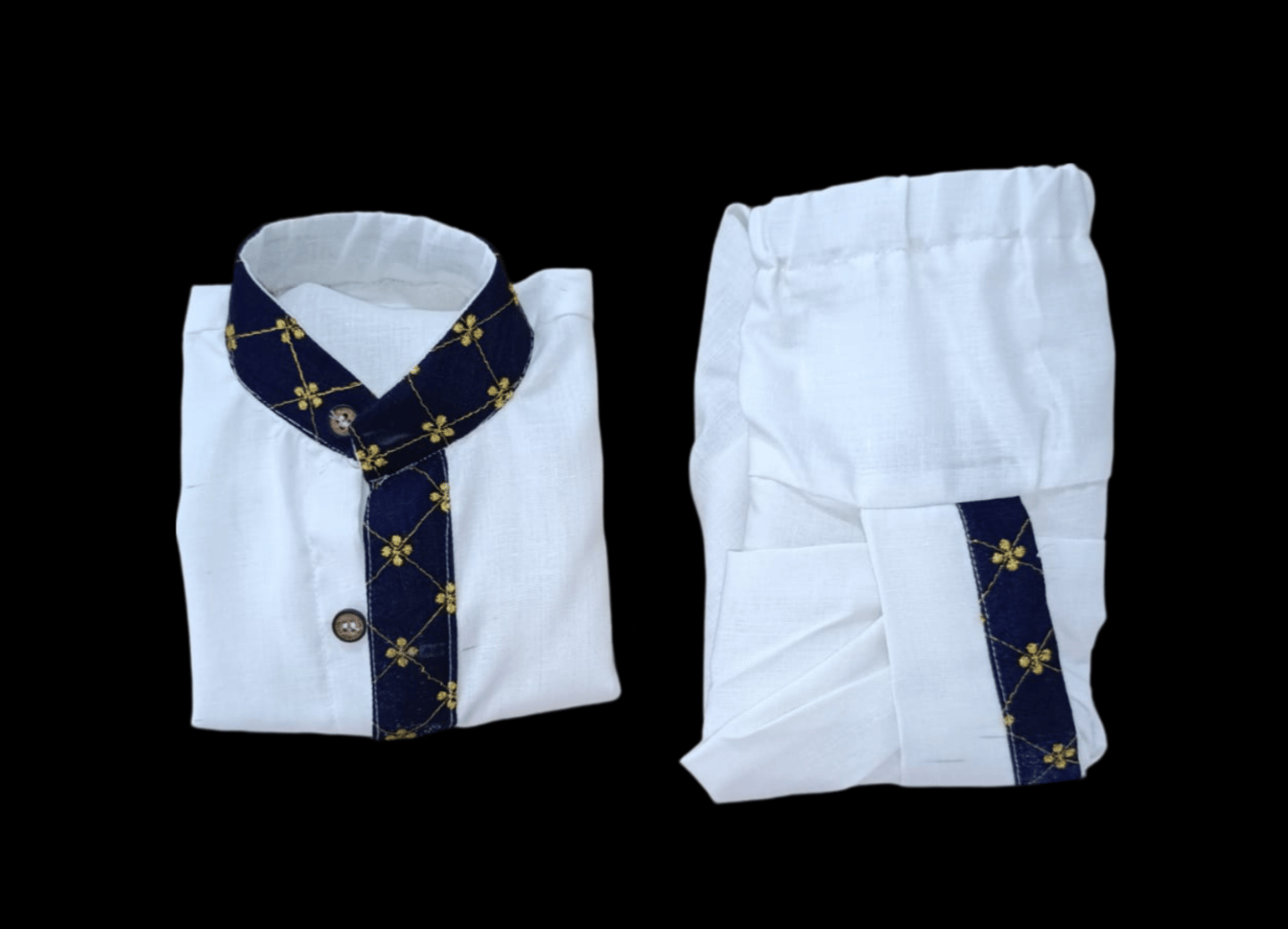 Traditional white cotton dhoti kurta set with blue embroidery.