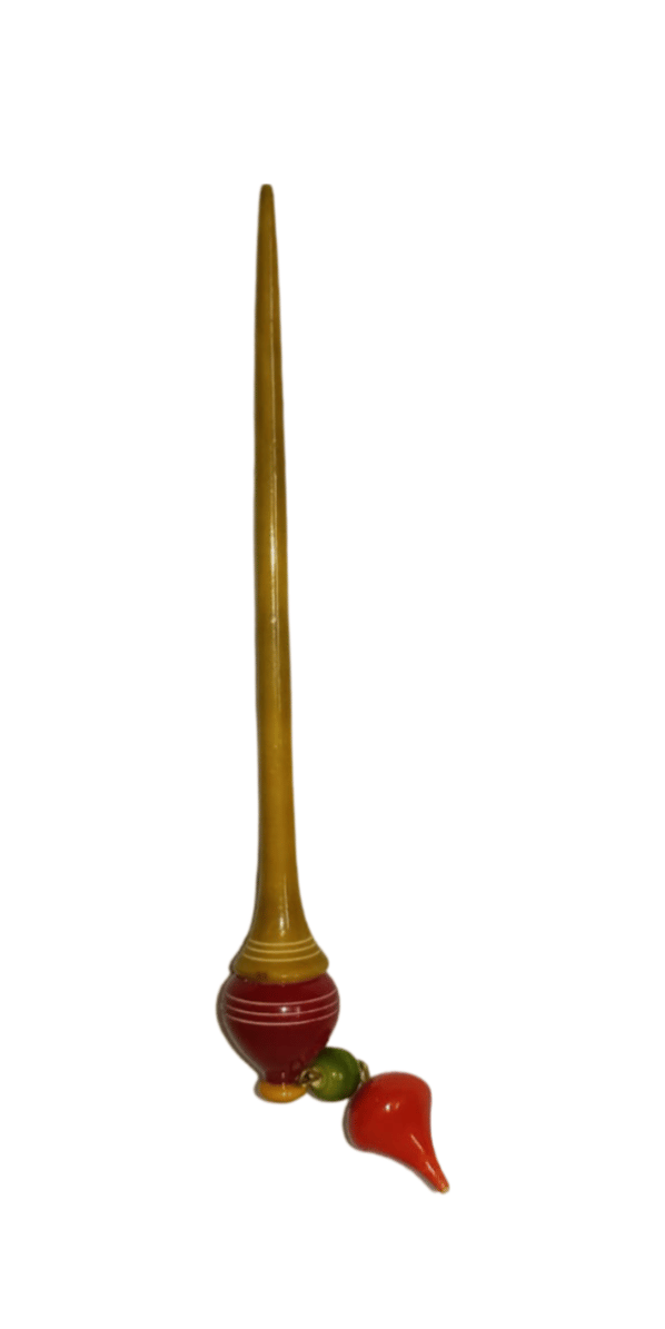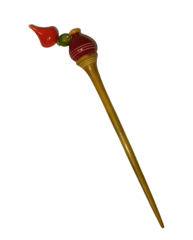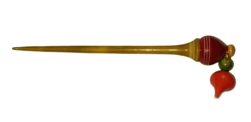 A beautifully crafted wooden hair bun stick in a mustard color, perfect for securing elegant hairstyles.