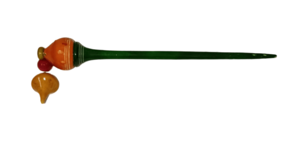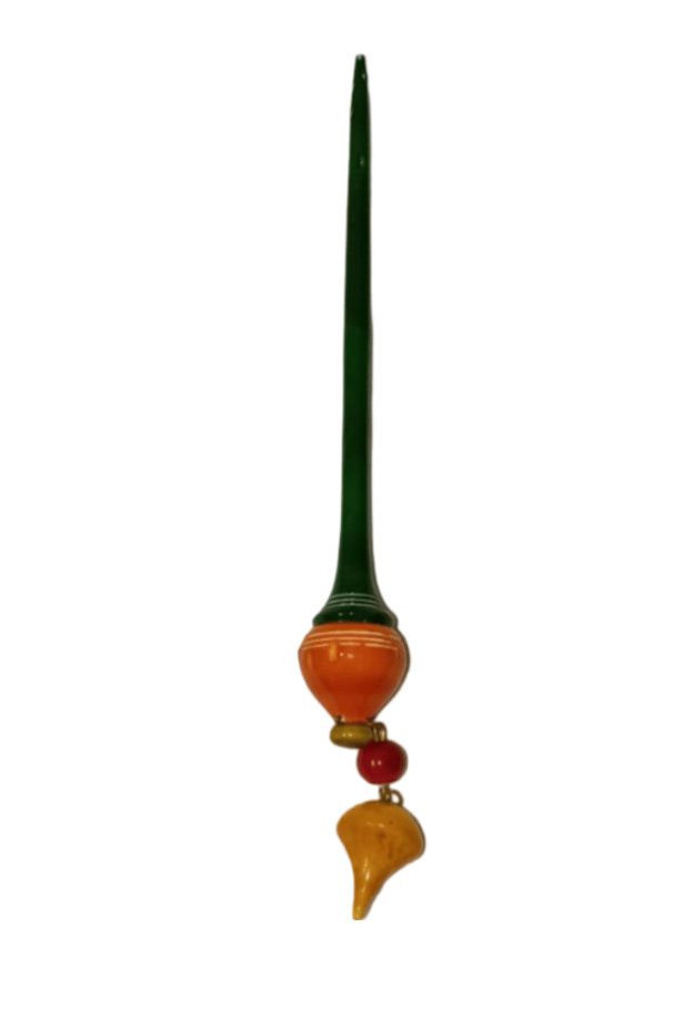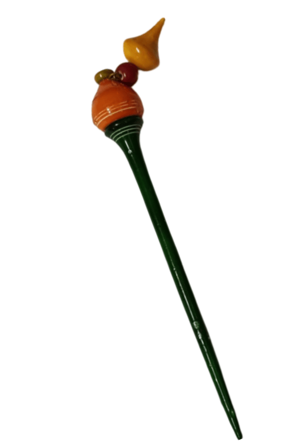 Beautifully carved wooden hair stick with a traditional Indian motif in green.