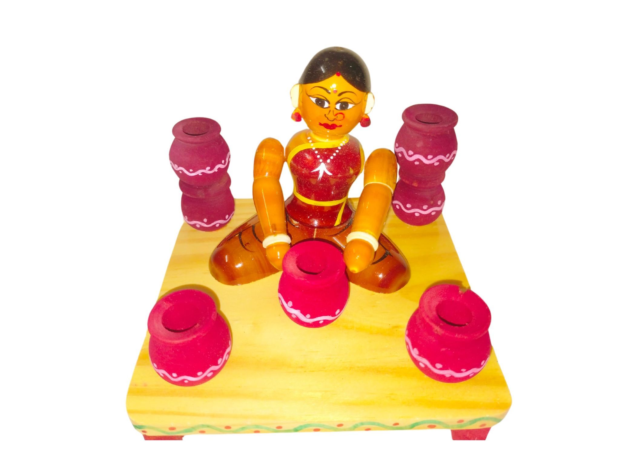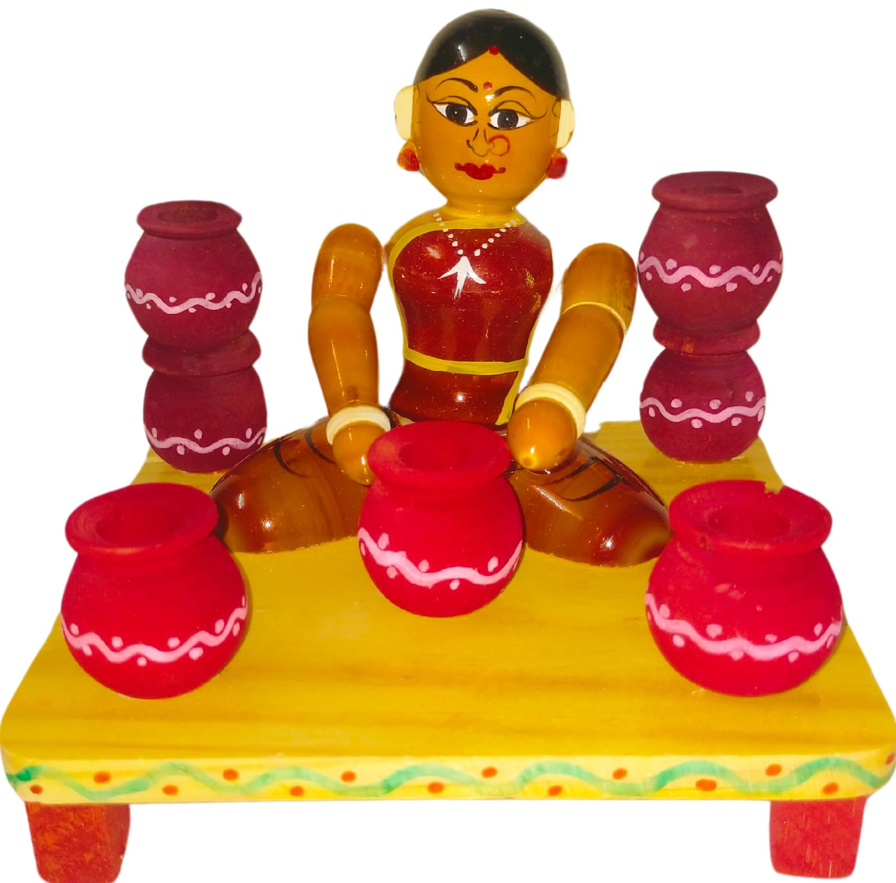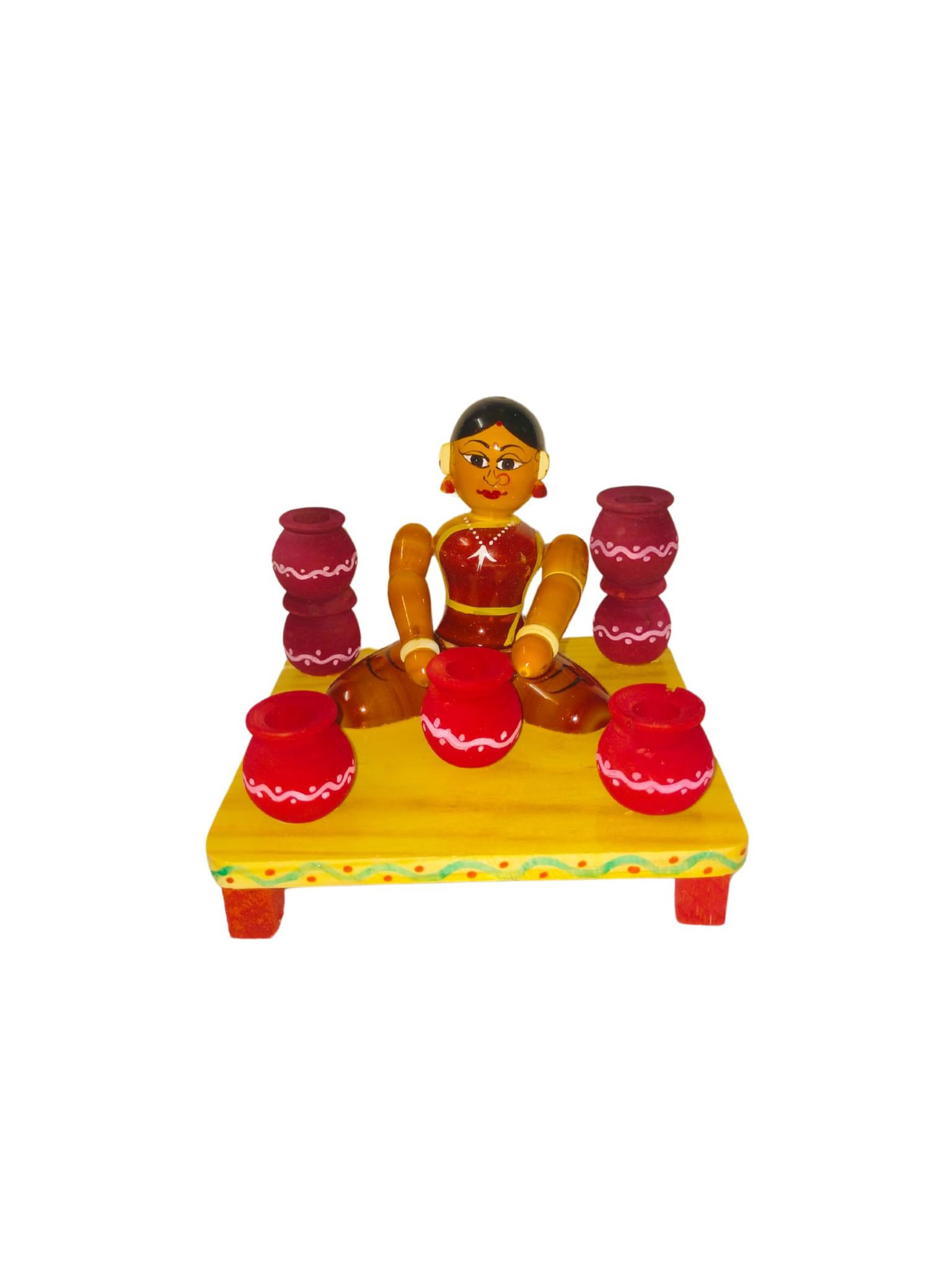 A handcrafted wooden lady figurine with pots, a charming decor piece.