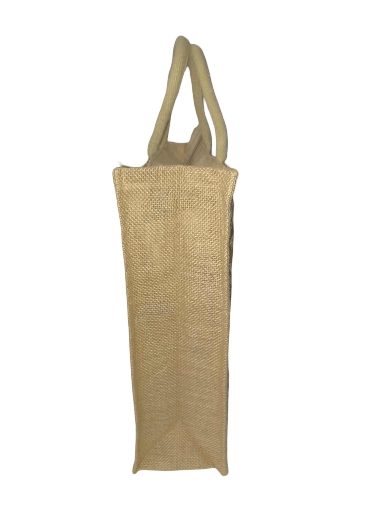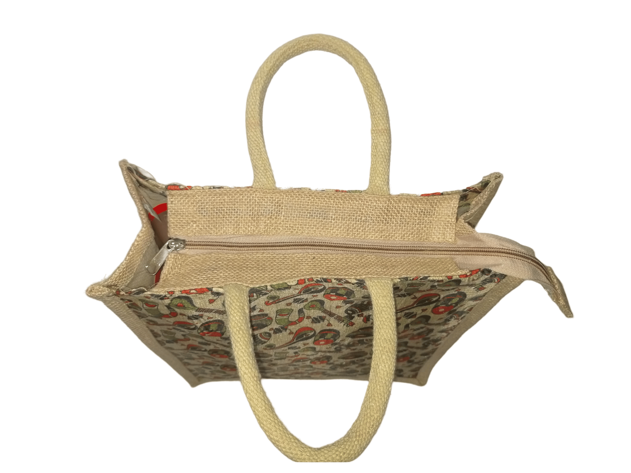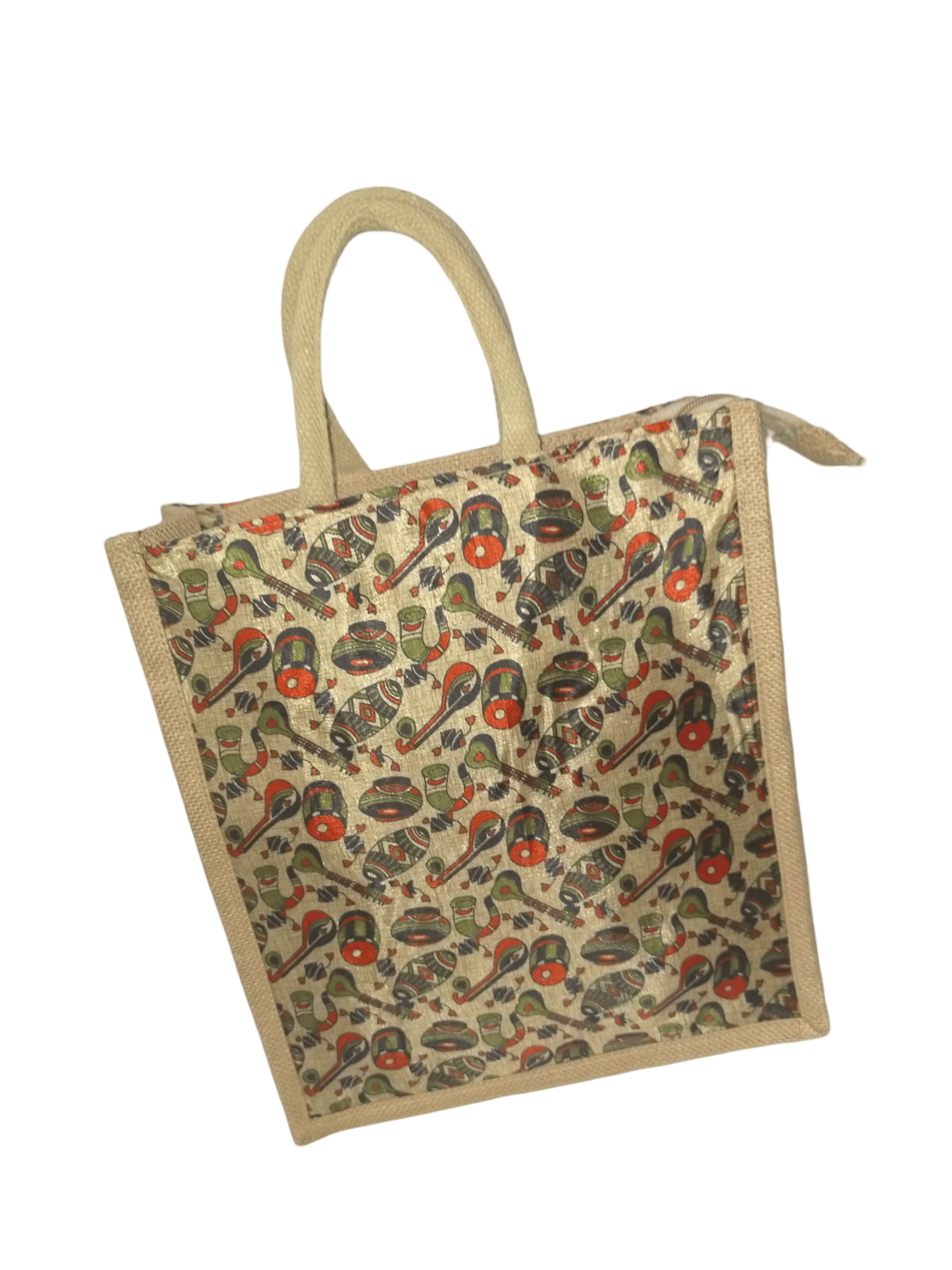 A charming jute lunch bag featuring colorful Indian musical instrument prints.