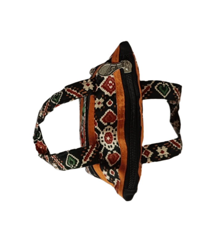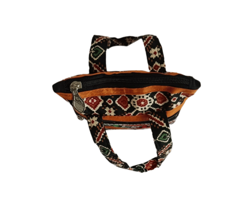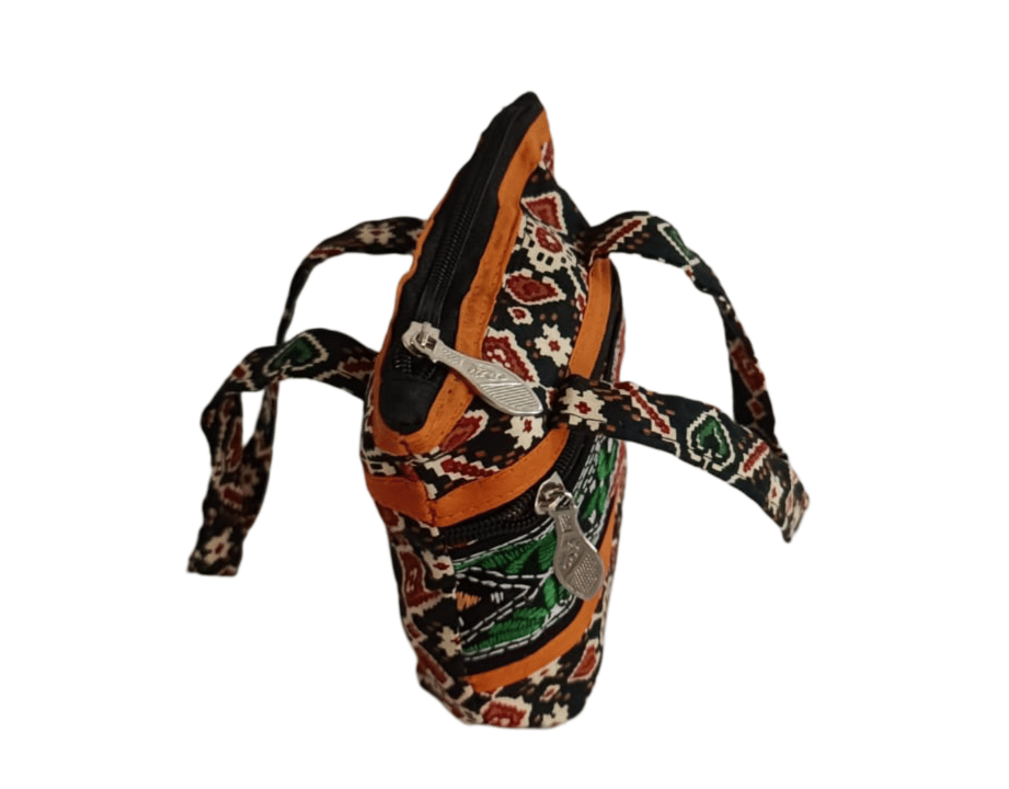 Stylish handcrafted Batik fabric handbag with detailed embroidery.