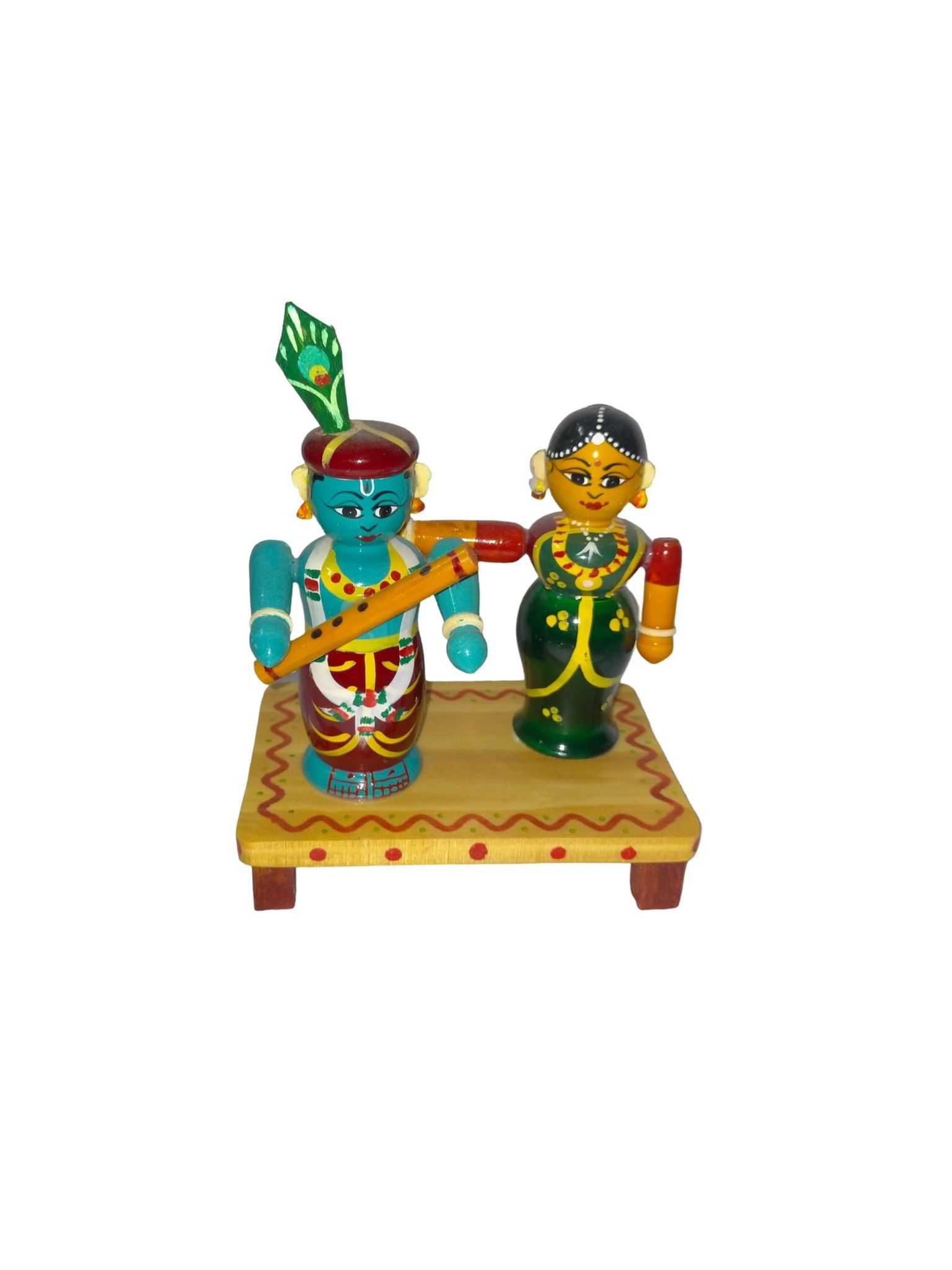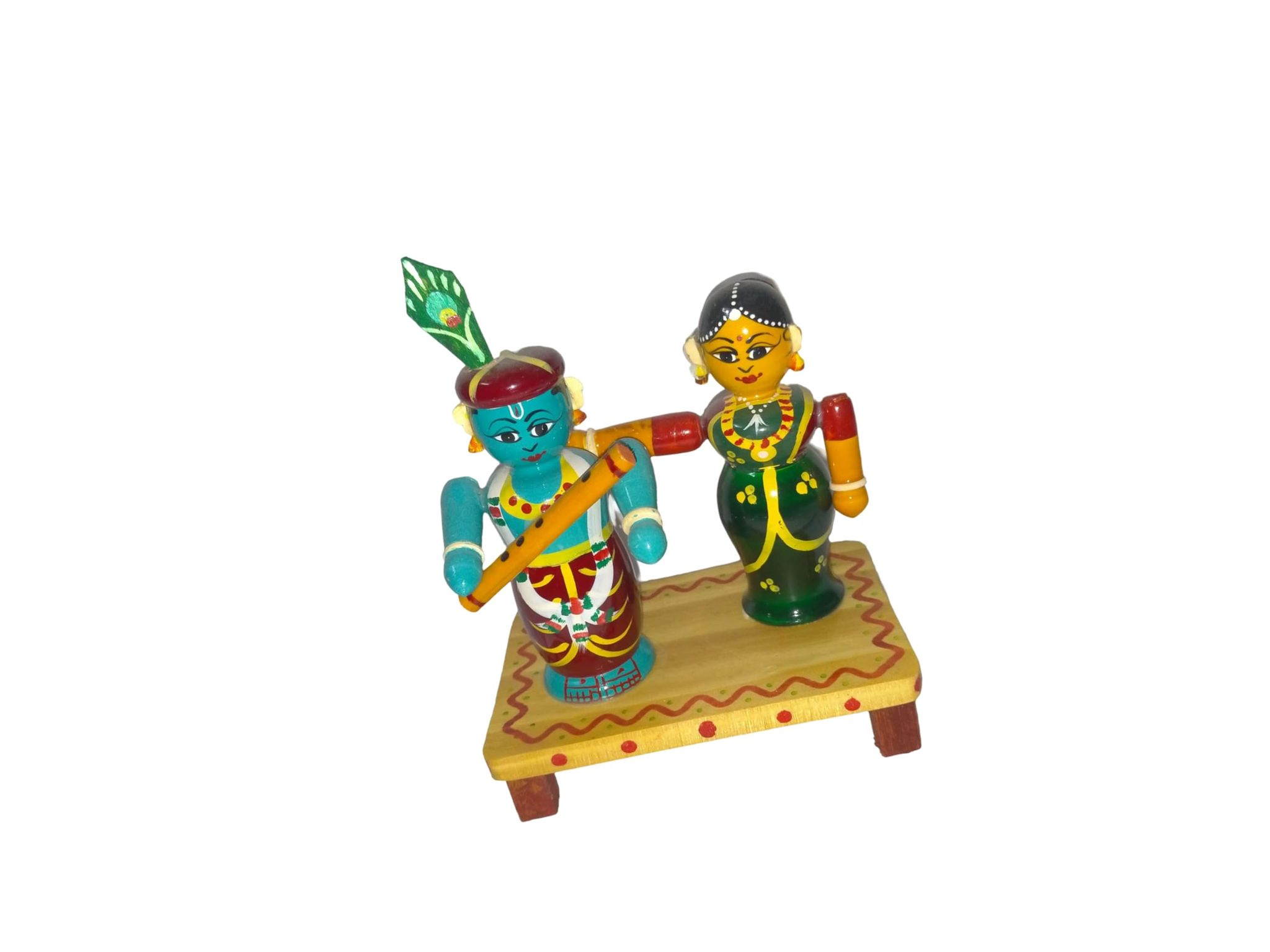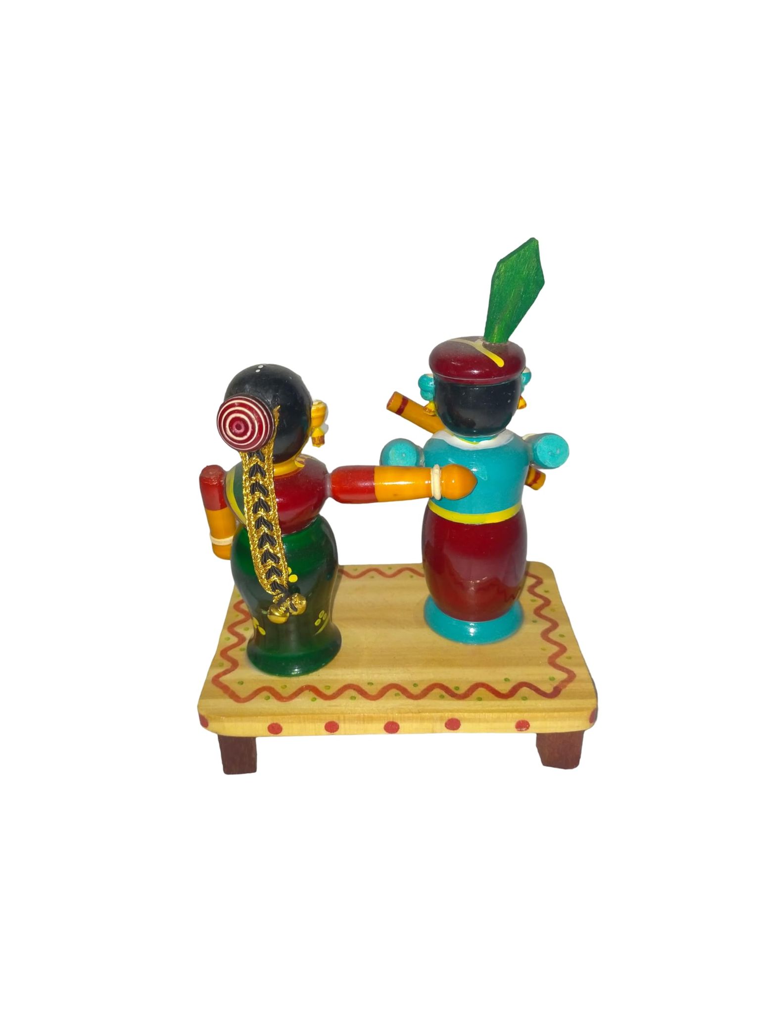 A divine wooden carving of Radha and Krishna, perfect for spiritual decor.