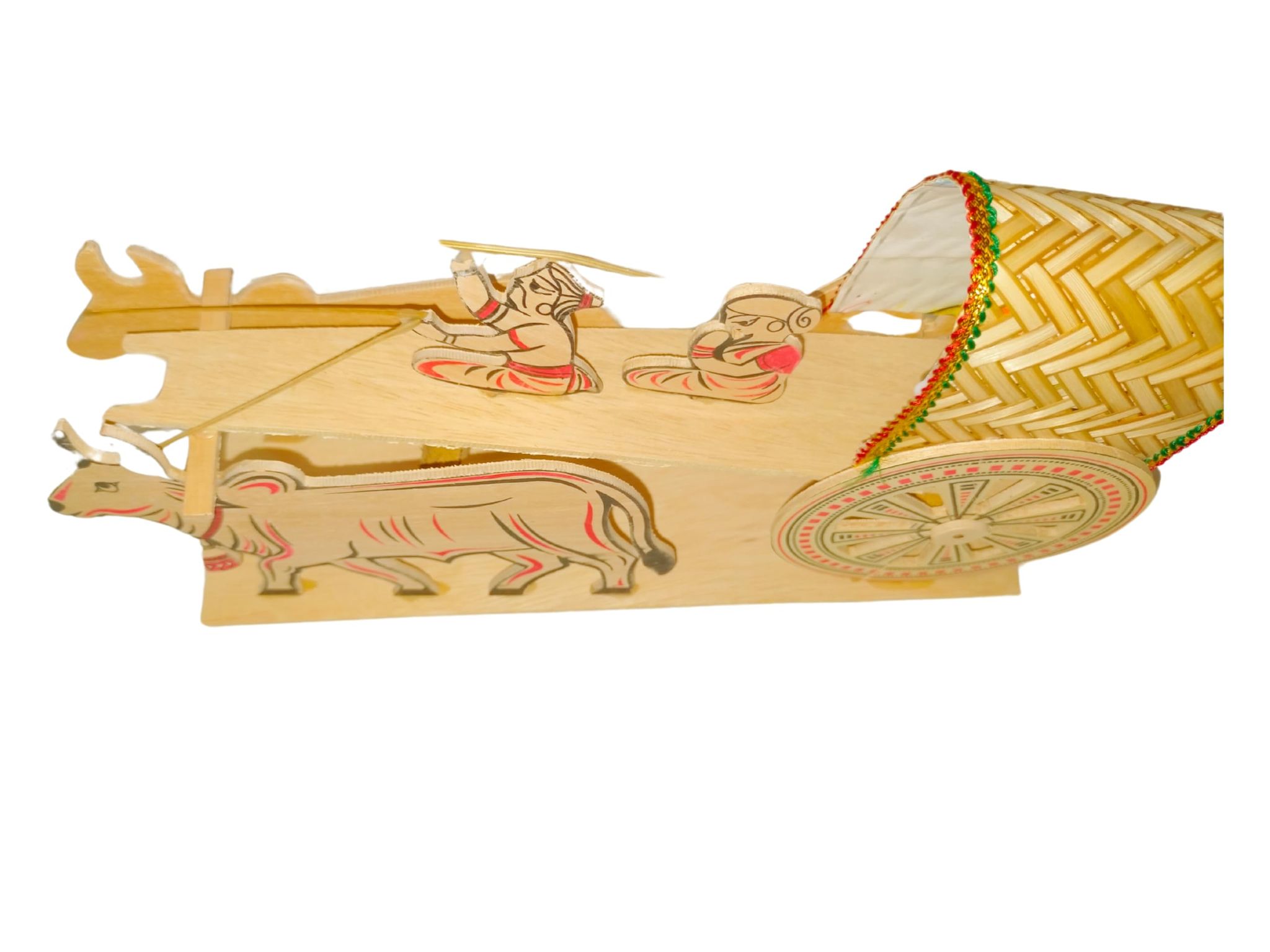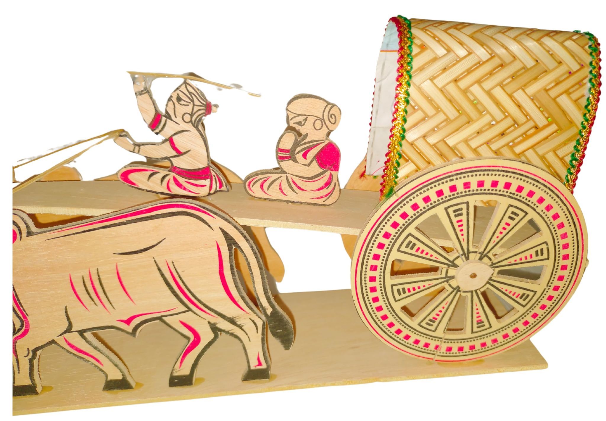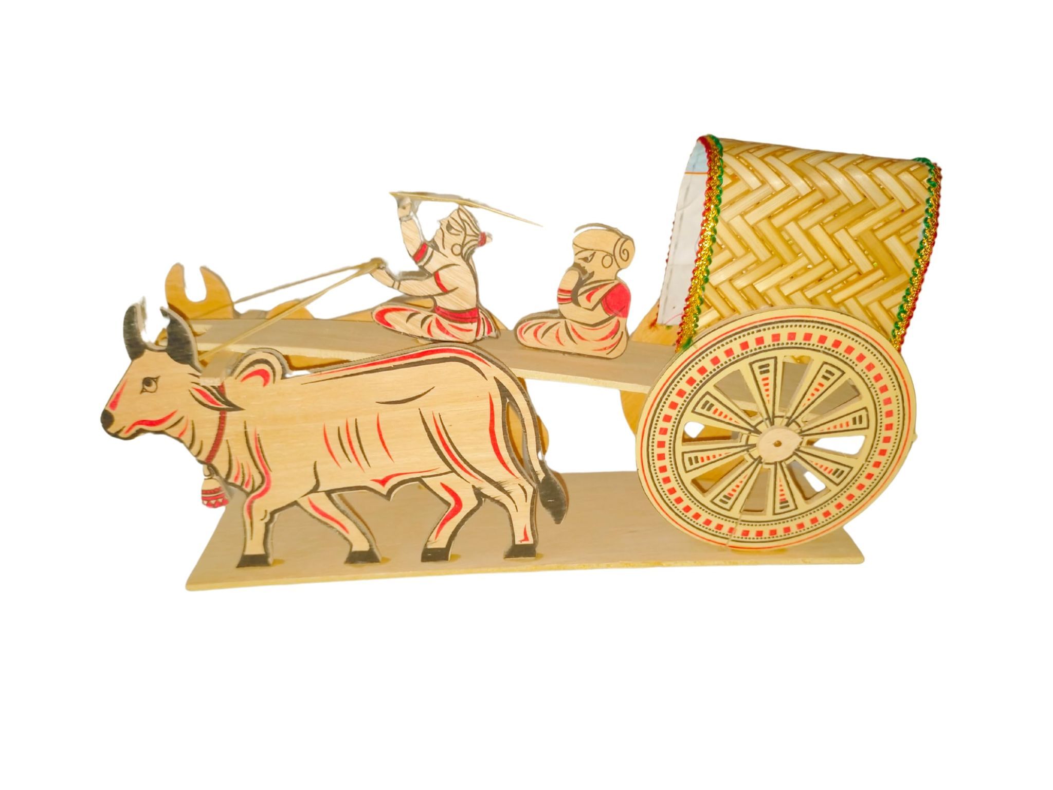 Kondapalli handcrafted wooden bullock cart in cream color.