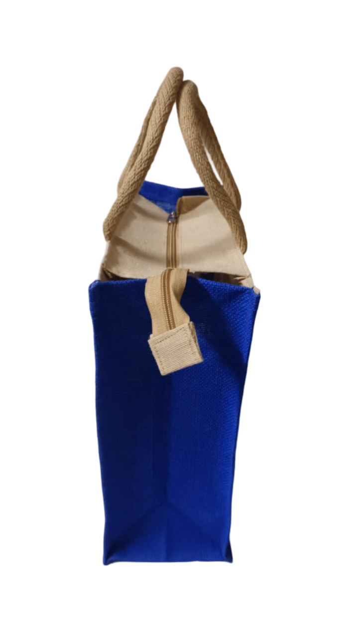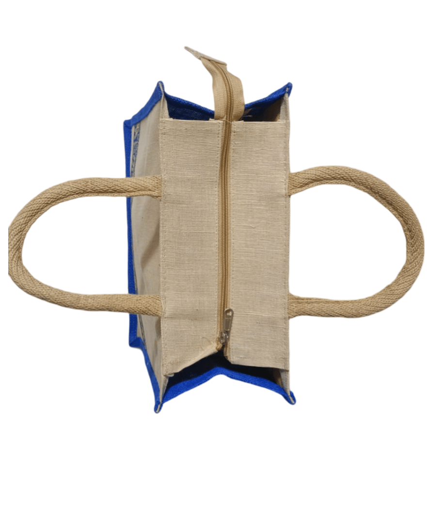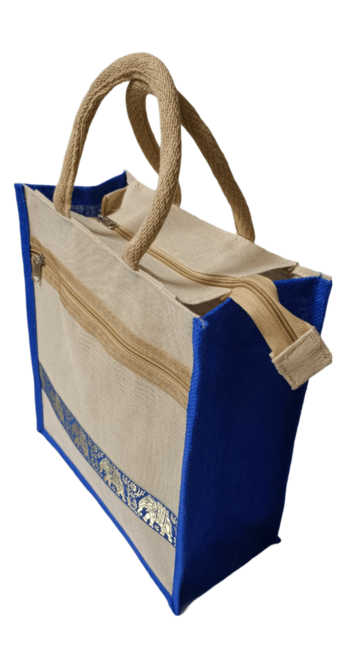 A chic jute bag with a unique elephant print and stylish blue trim, great for carrying essentials.