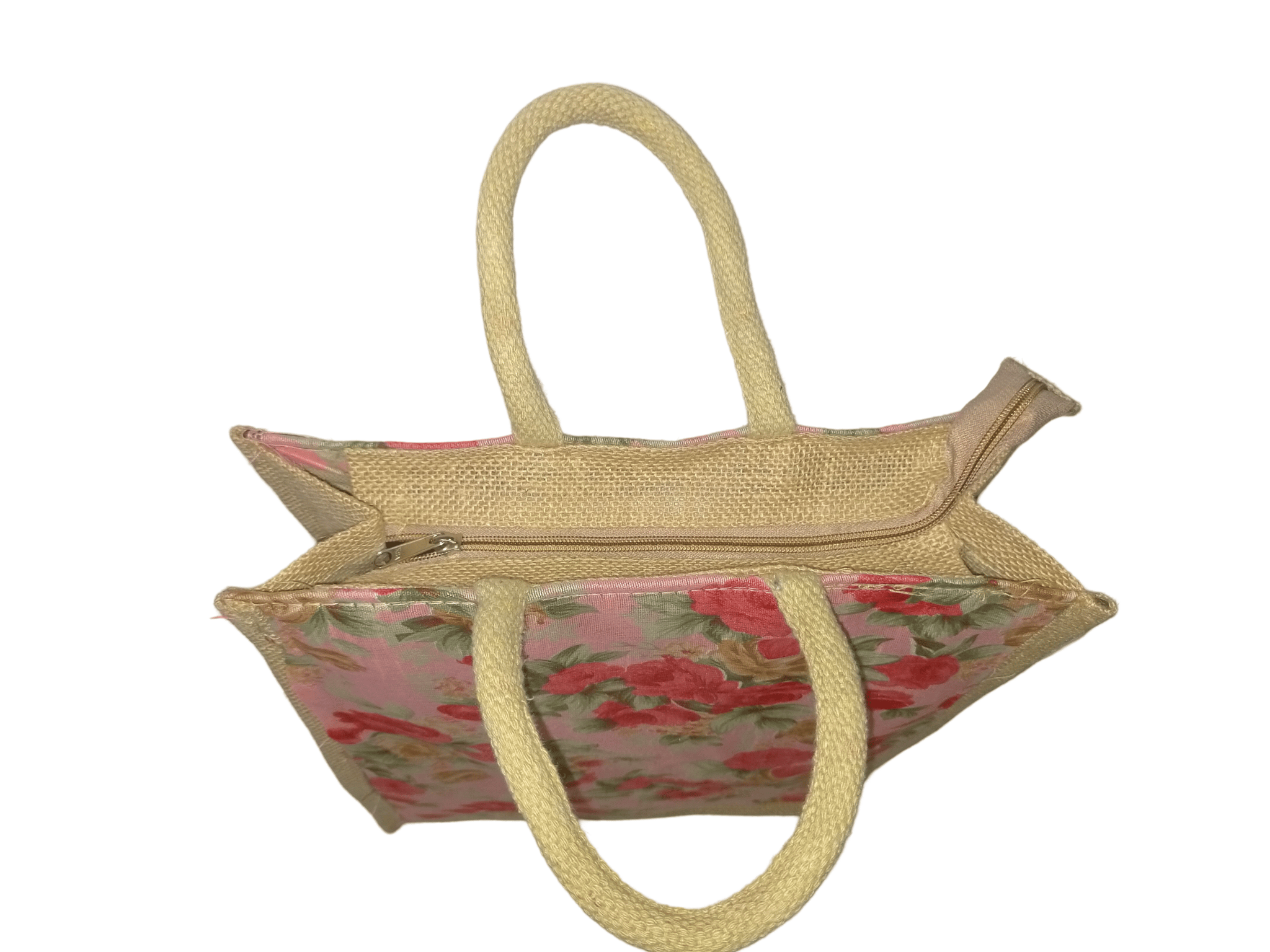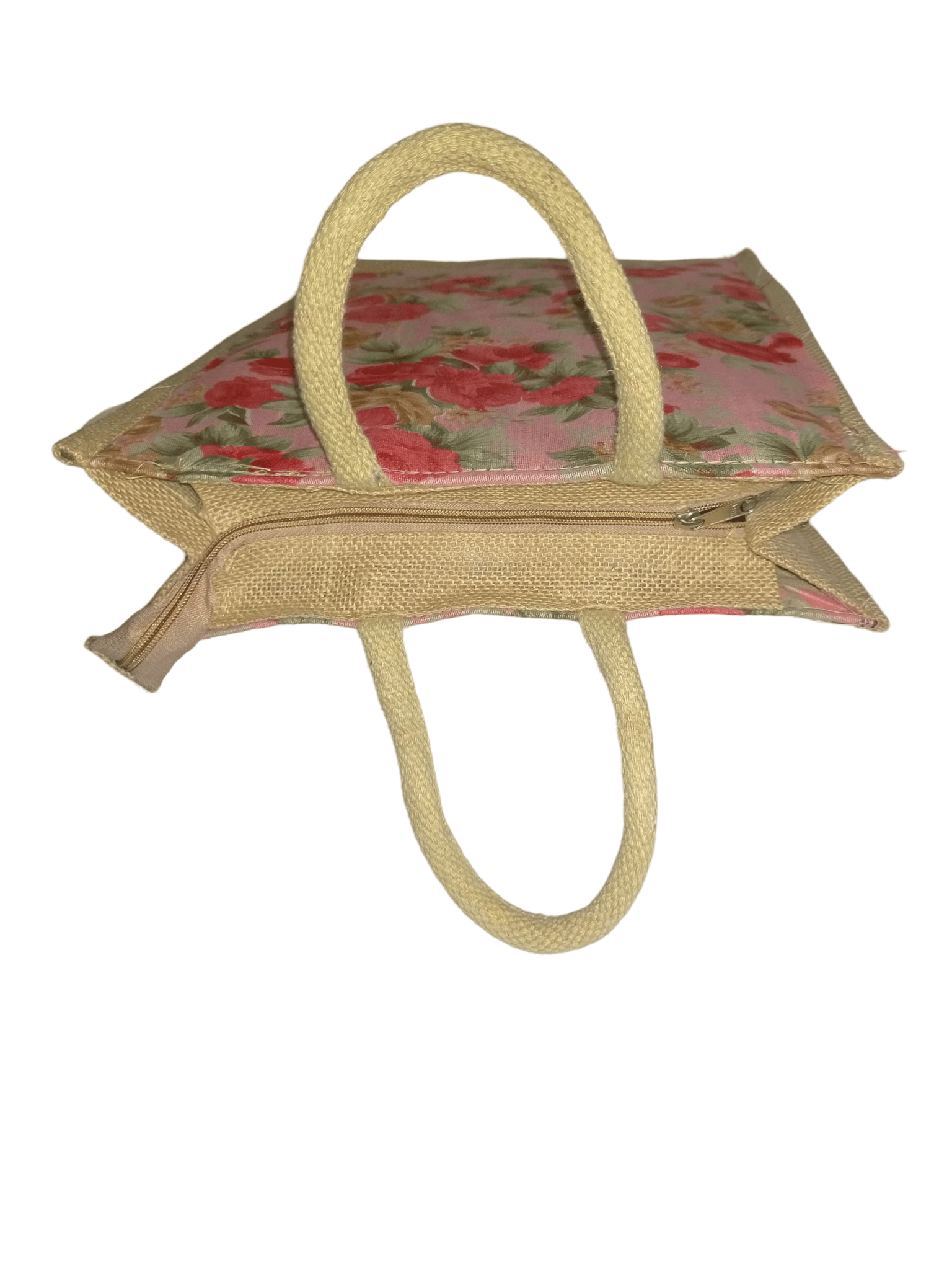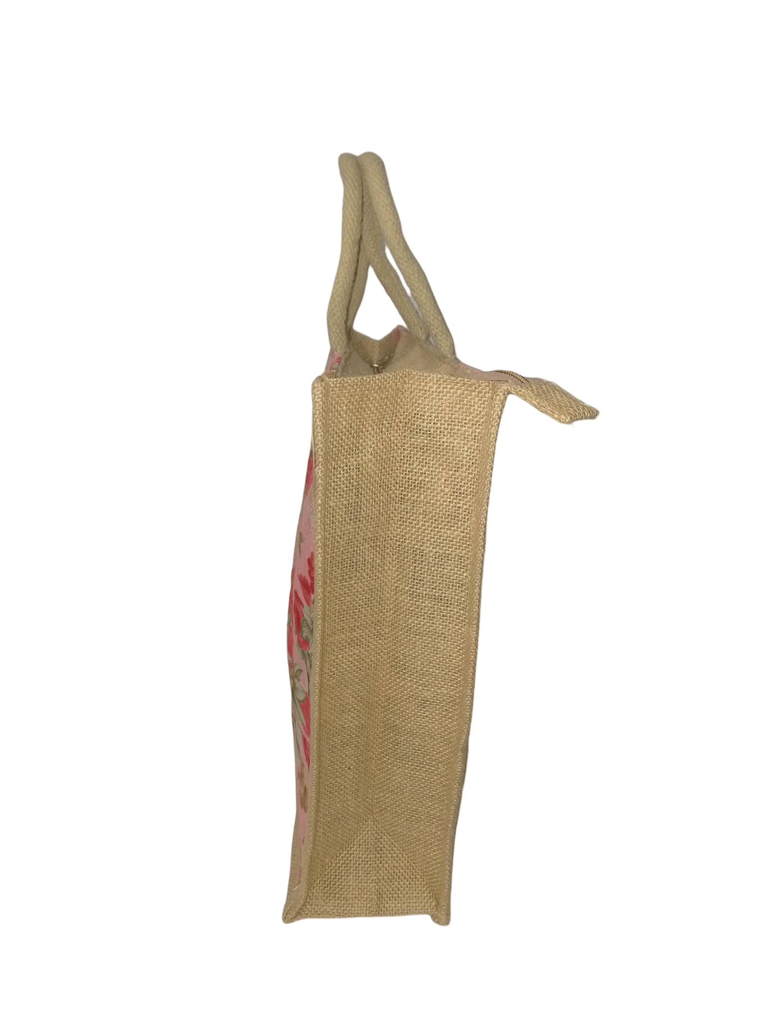 A medium-sized jute tote bag with a beautiful floral print, perfect for daily essentials.