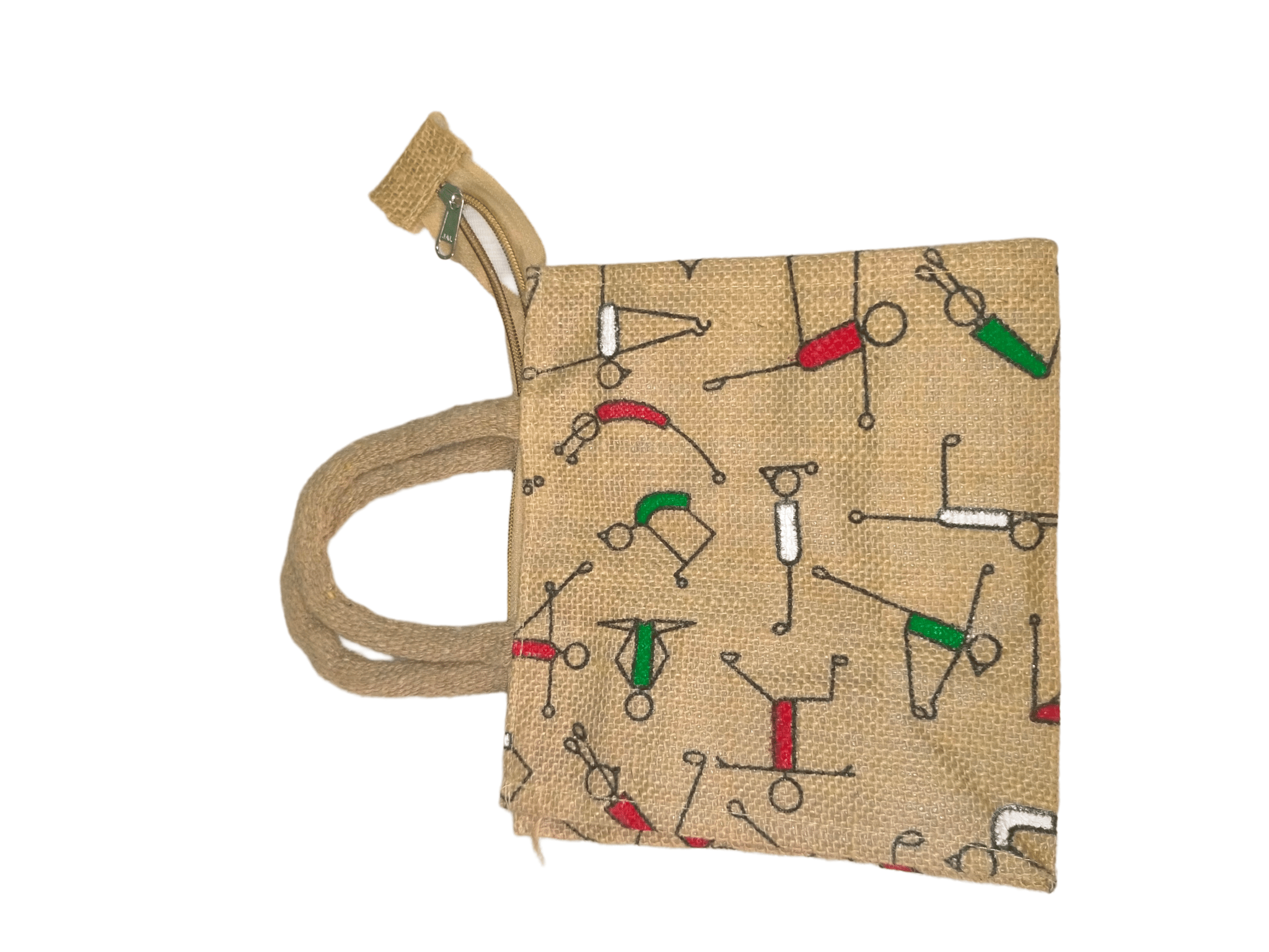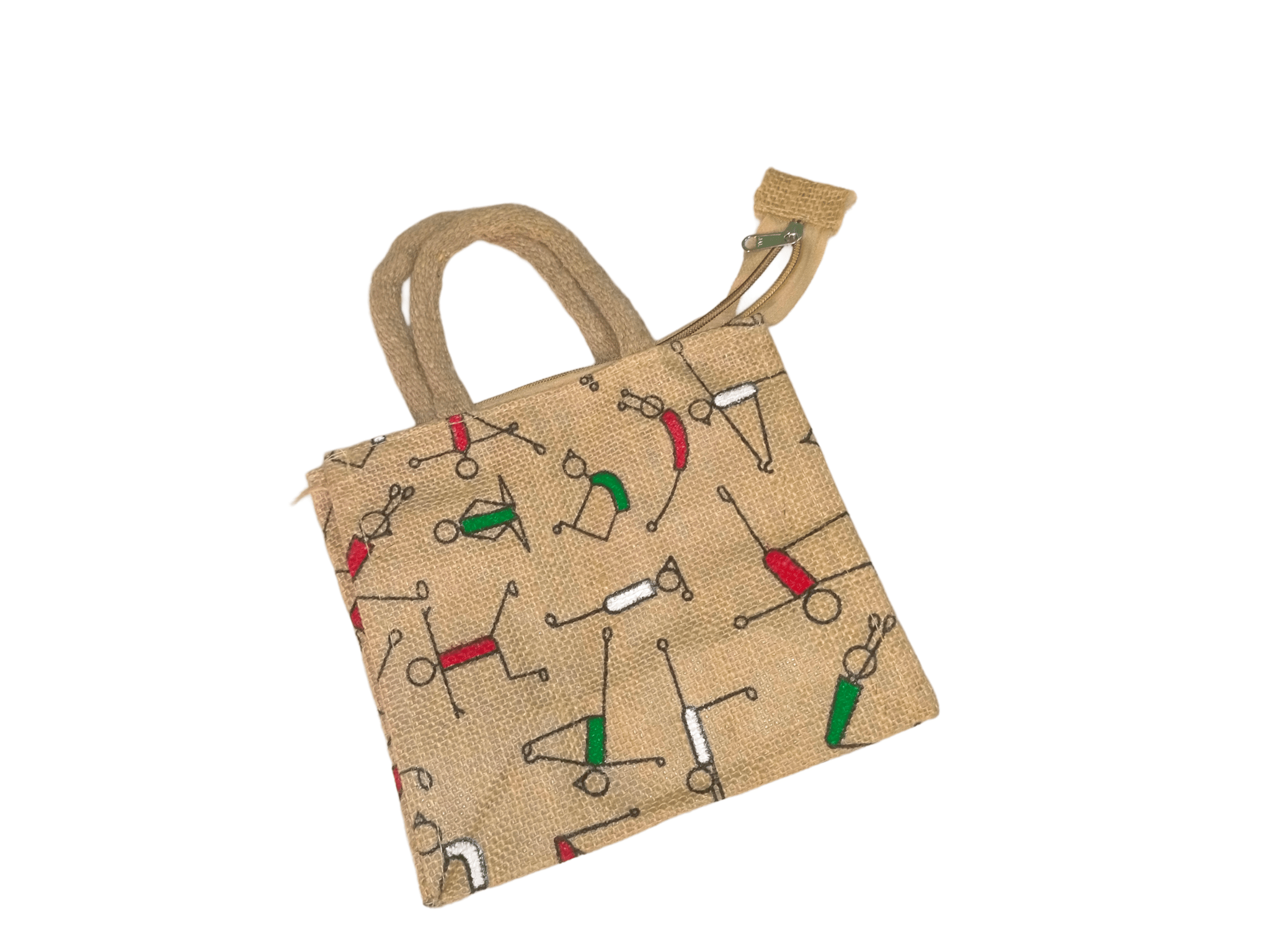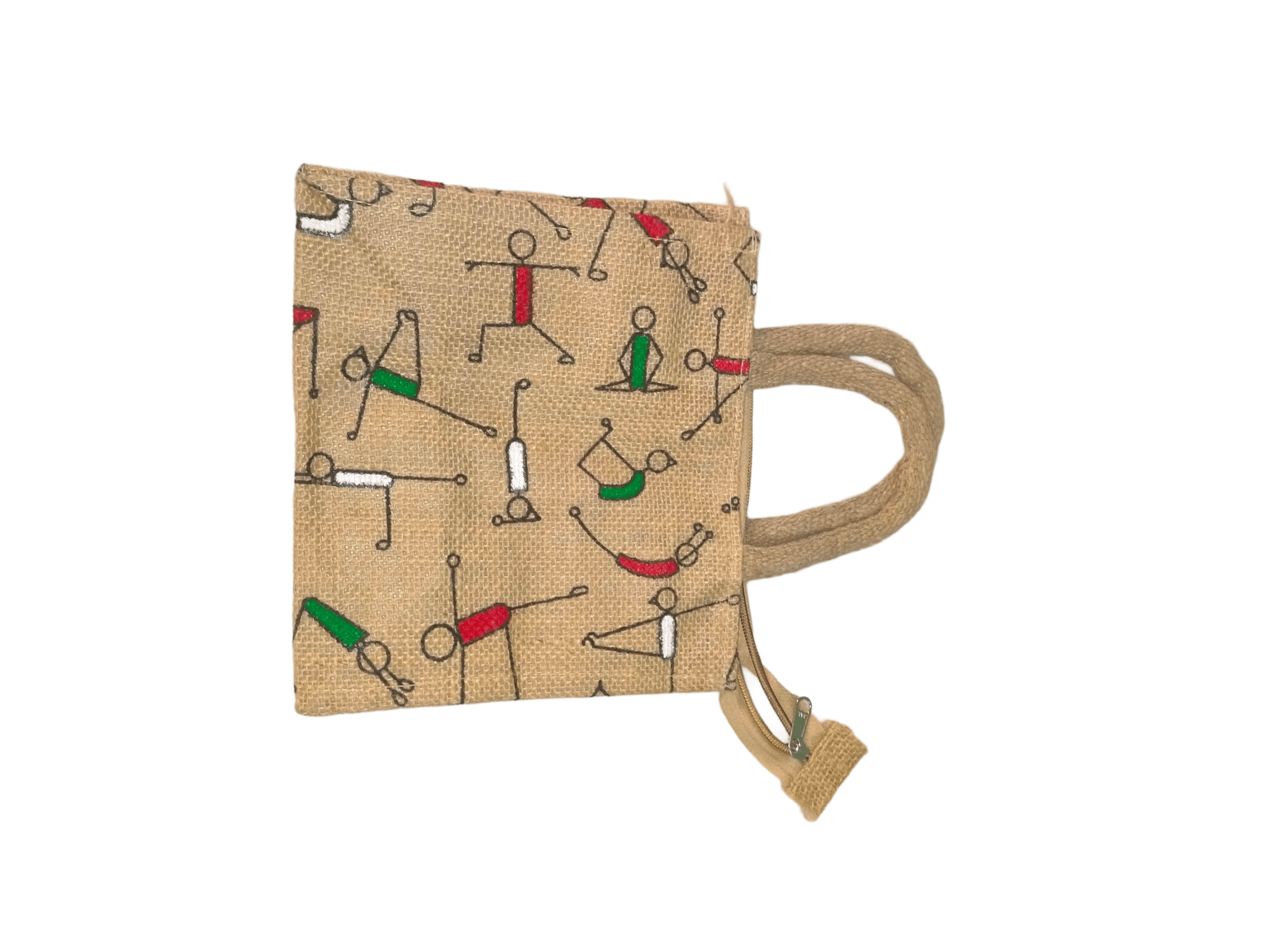 Eco-friendly jute bag featuring a unique yoga-inspired print.