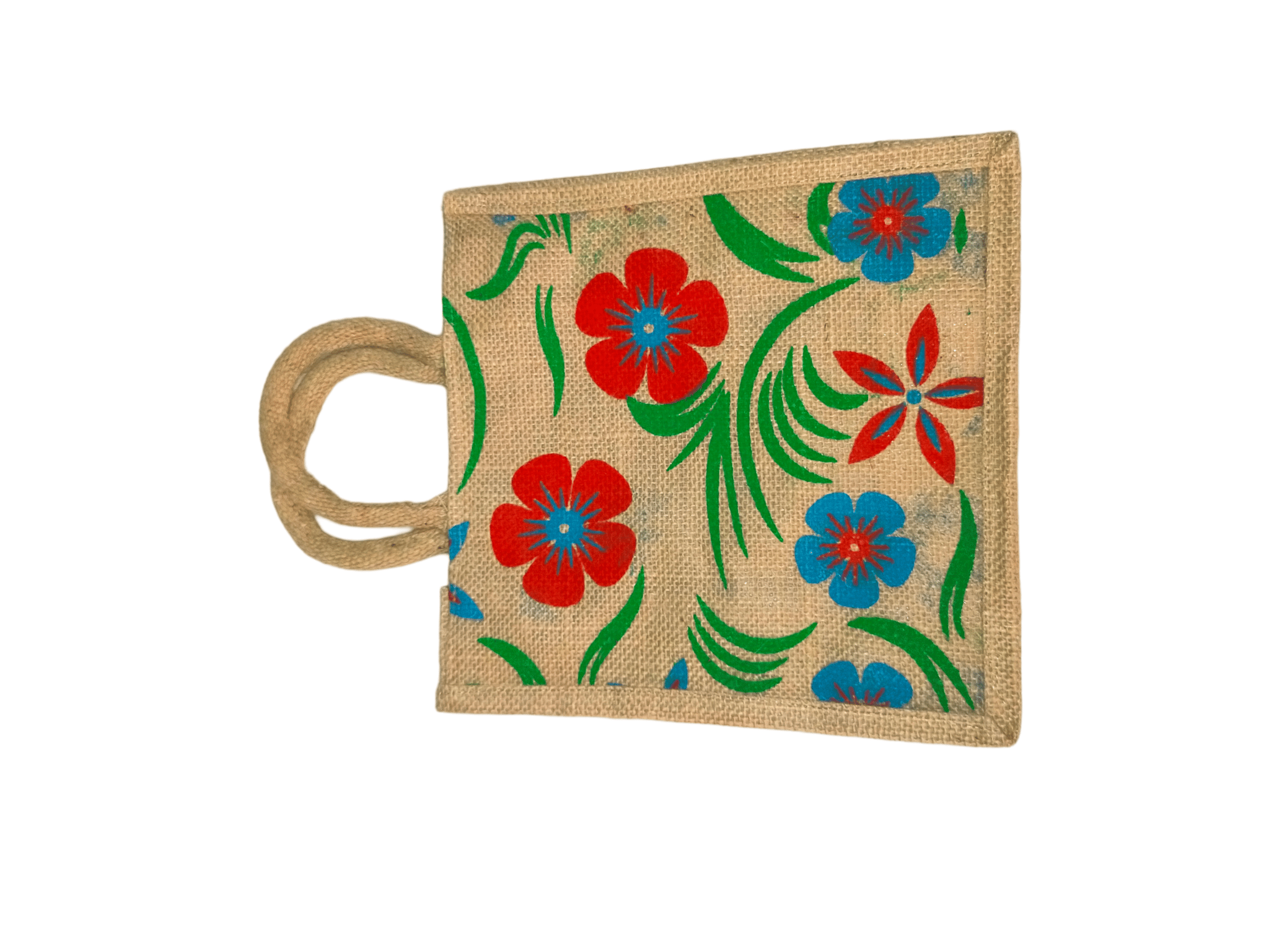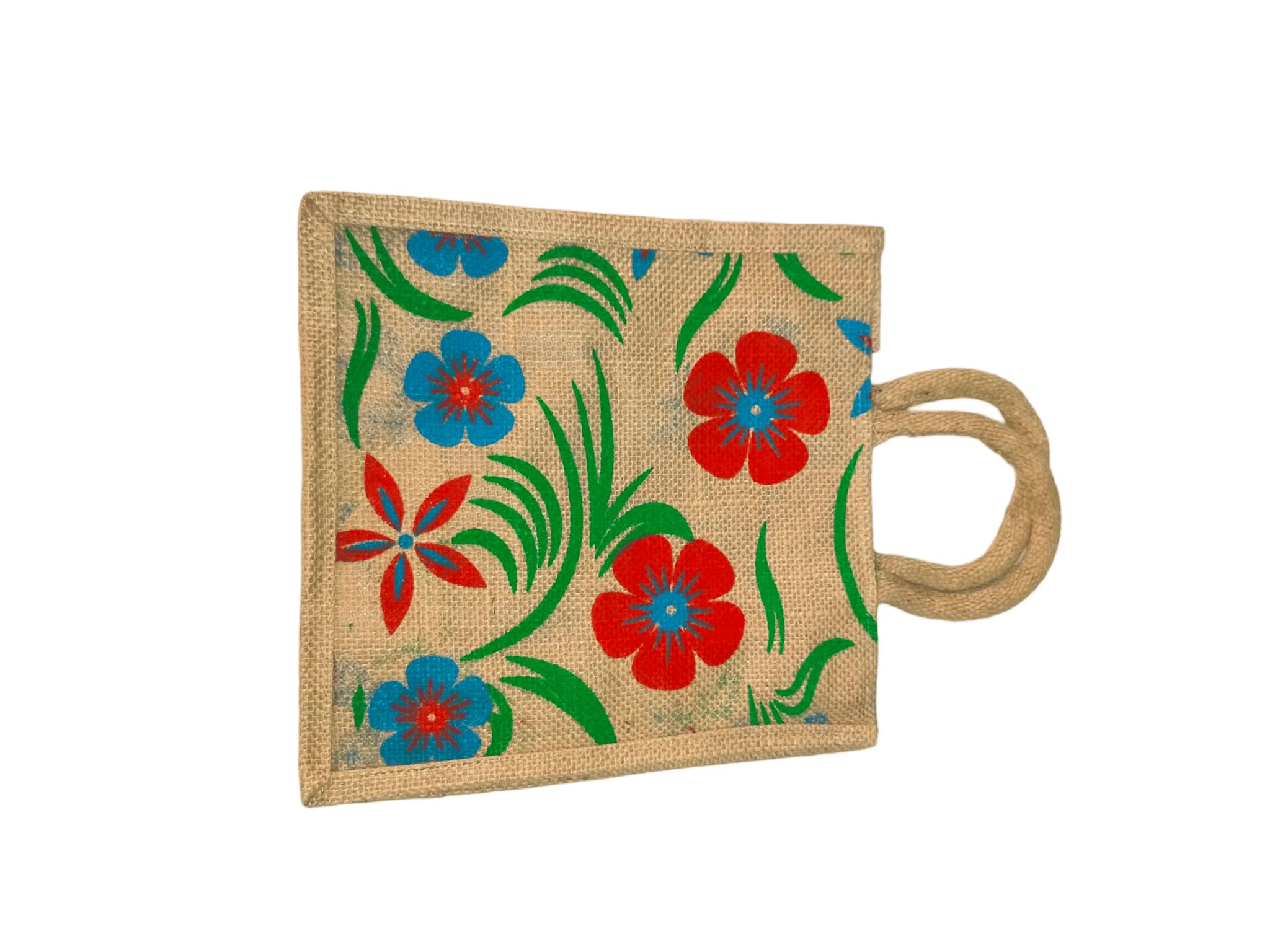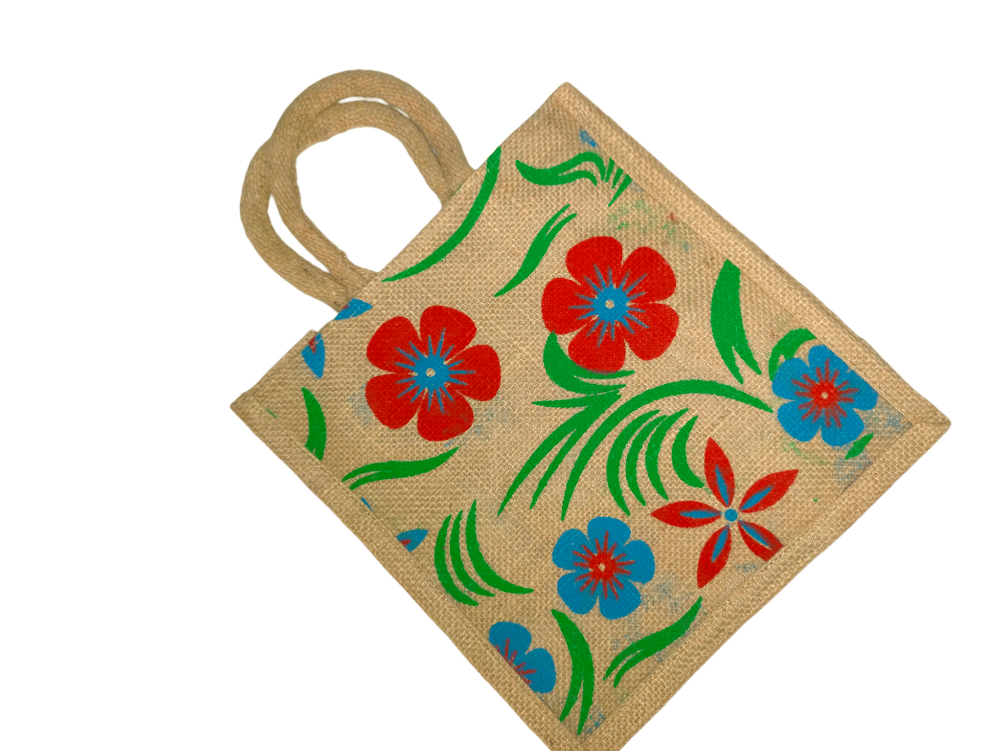 A lightweight and eco-friendly jute bag with a beautiful floral print.