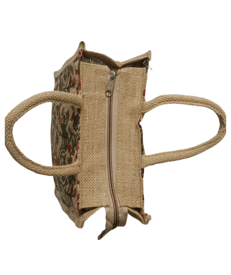 A compact and stylish jute tote bag featuring an artistic horse print design.