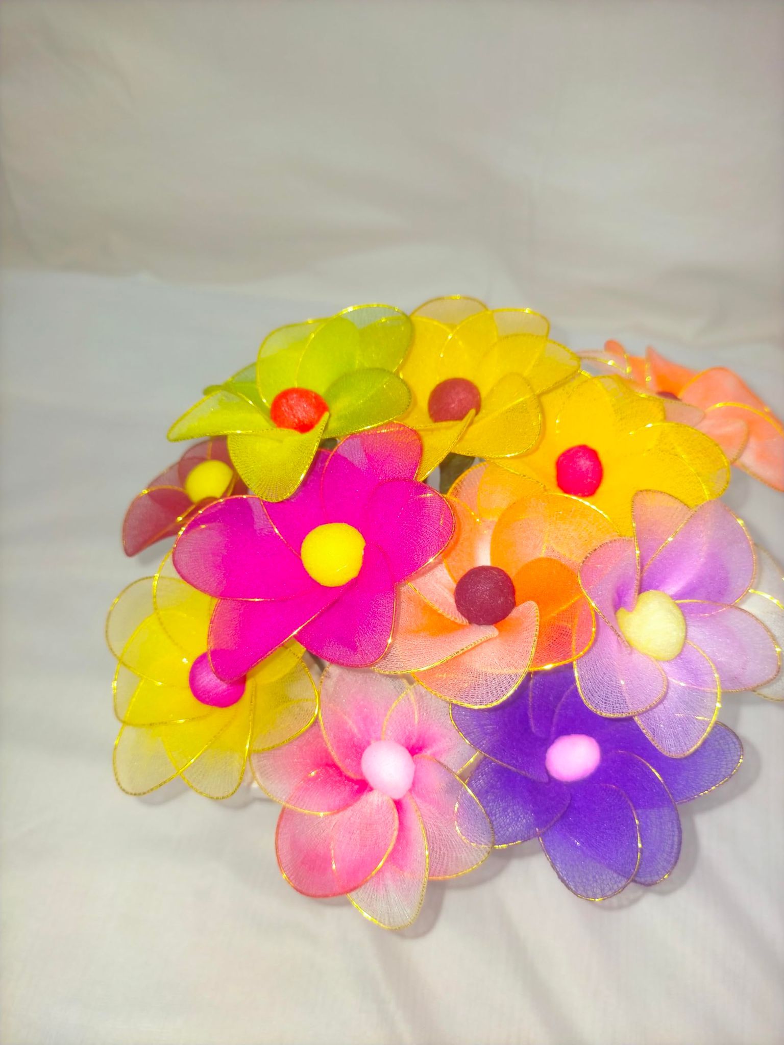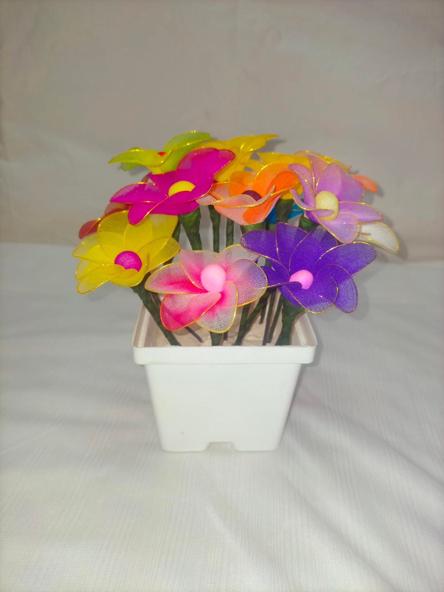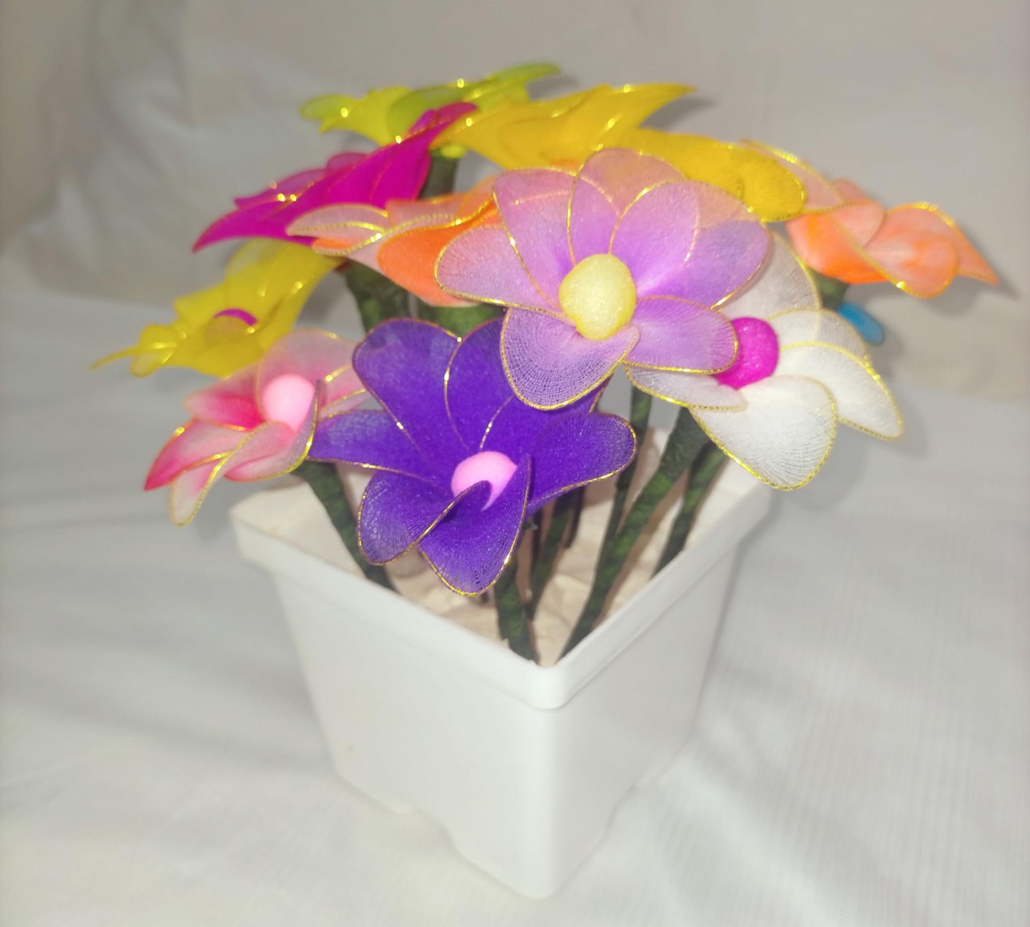 Handmade stocking flowers in a white pot, adding a pop of color to any space.