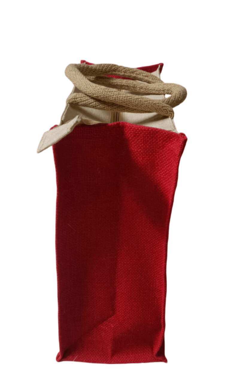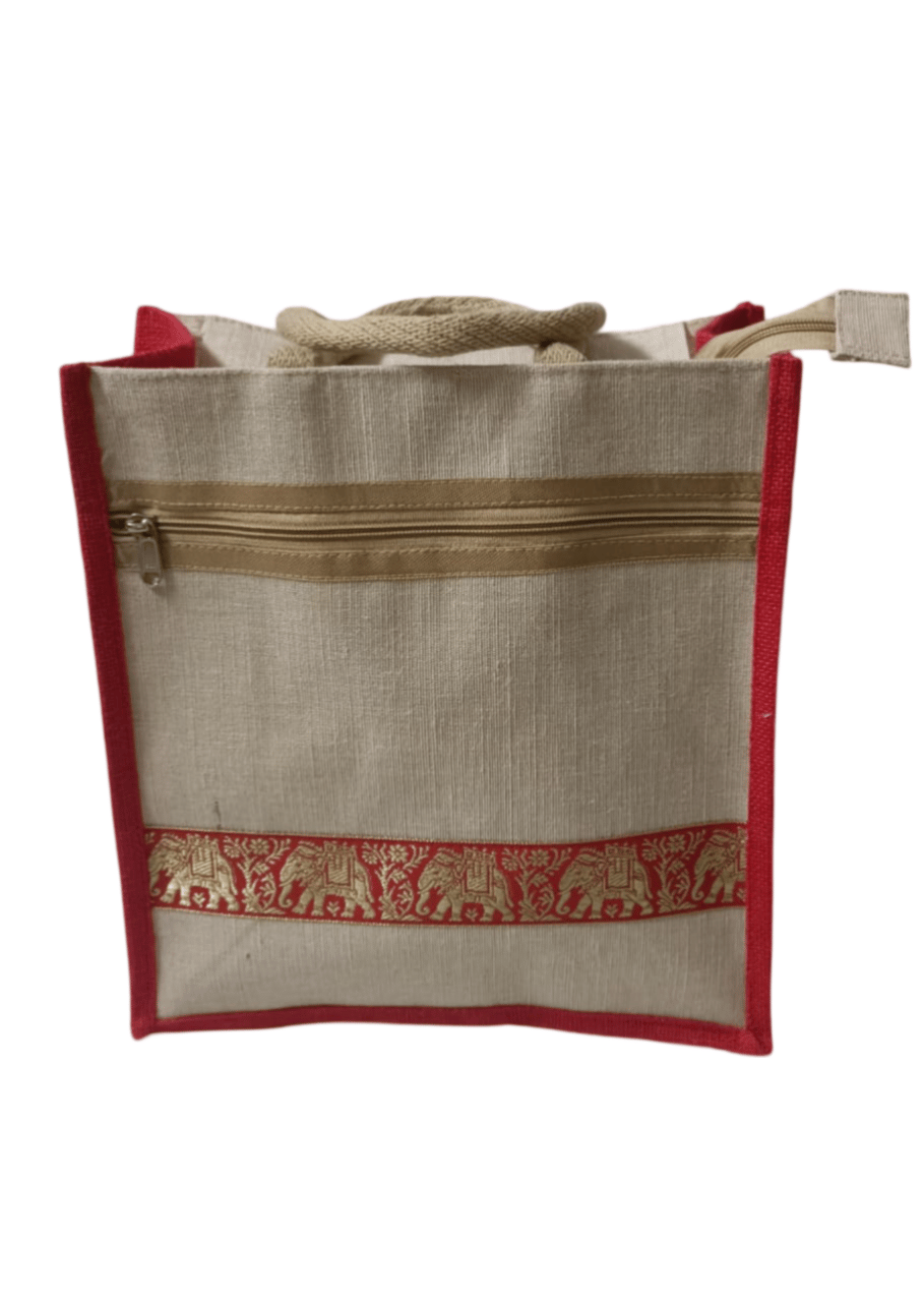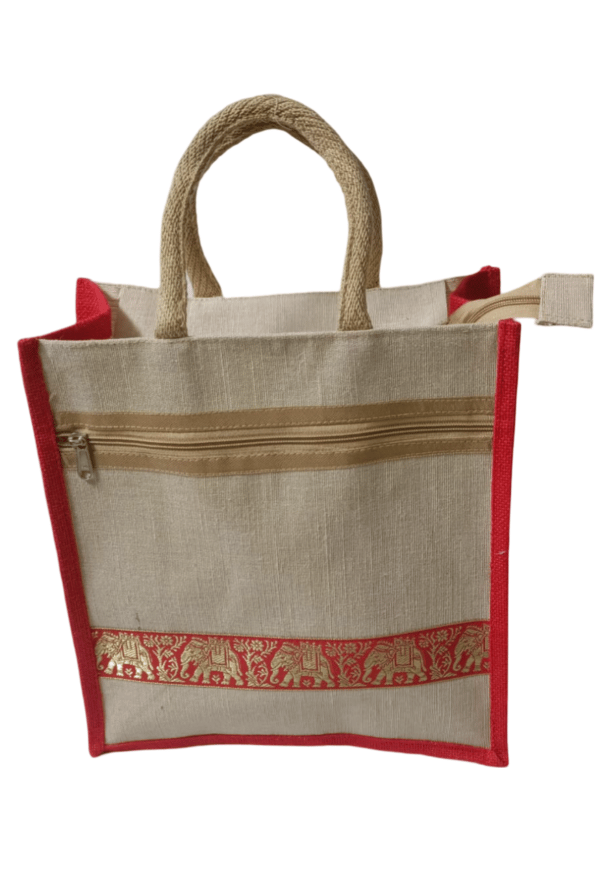 A vibrant red jute tote bag with a traditional elephant print, great for everyday use.