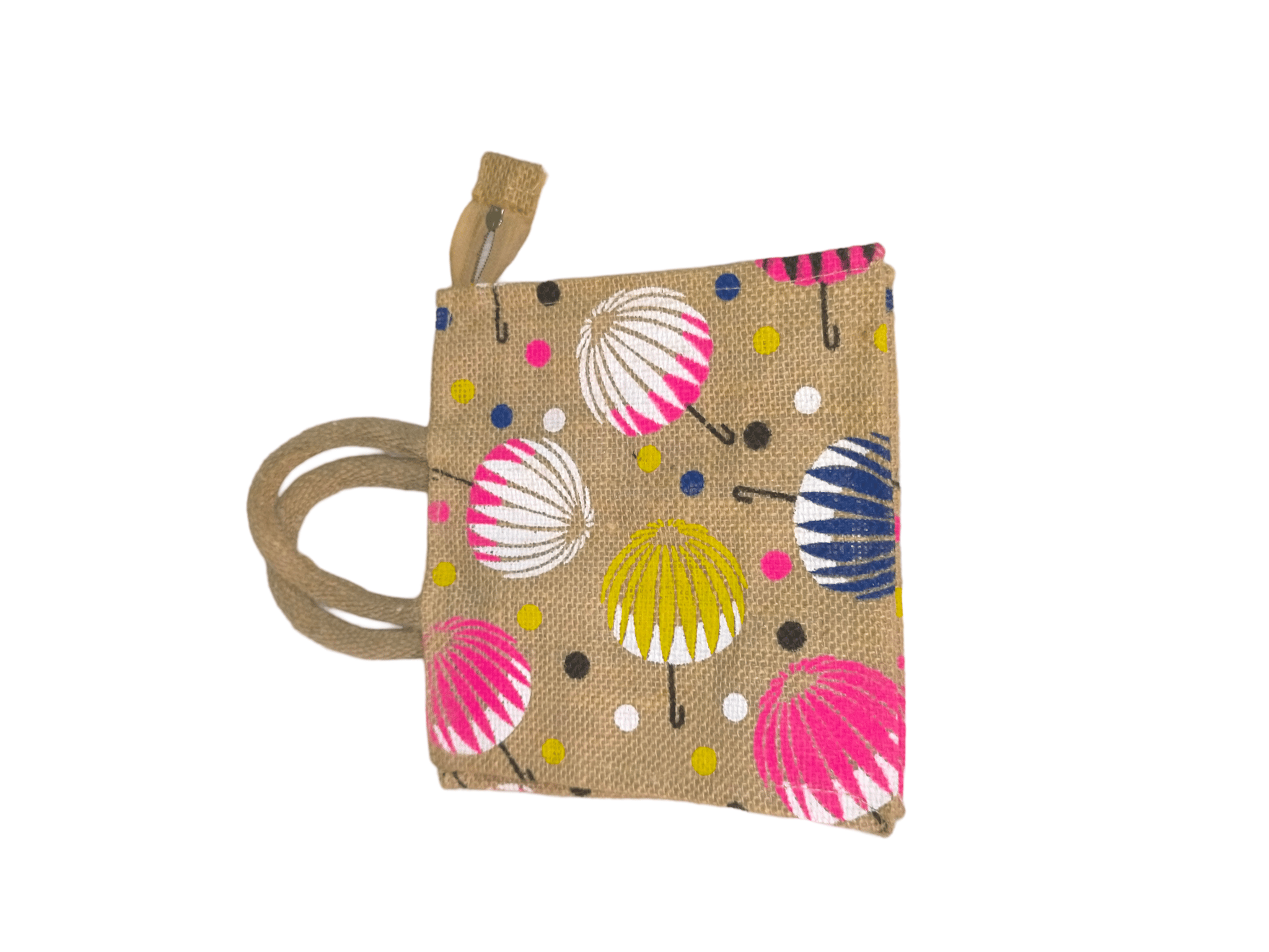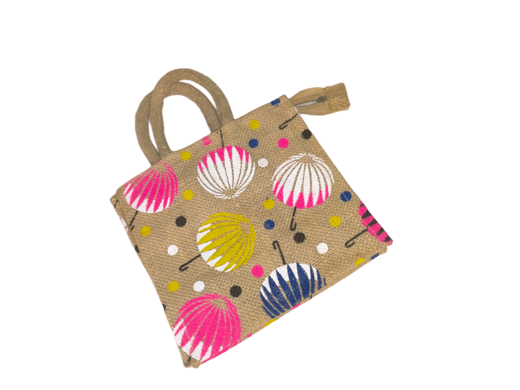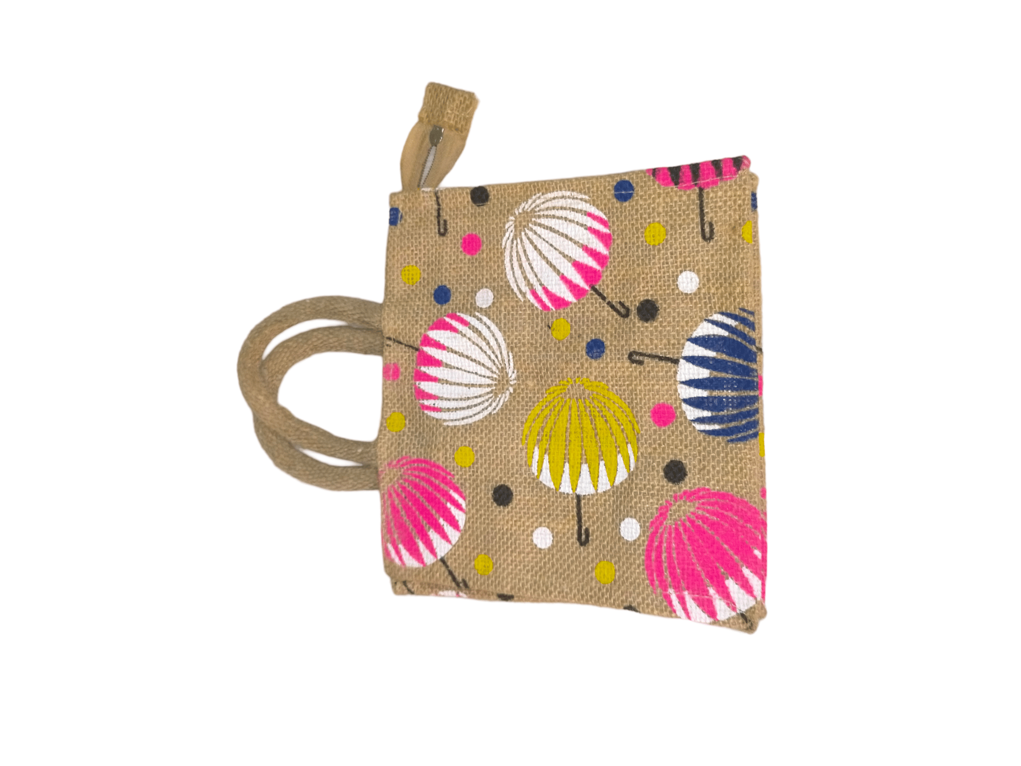 A fun and vibrant jute bag with an umbrella design, ideal for daily use.