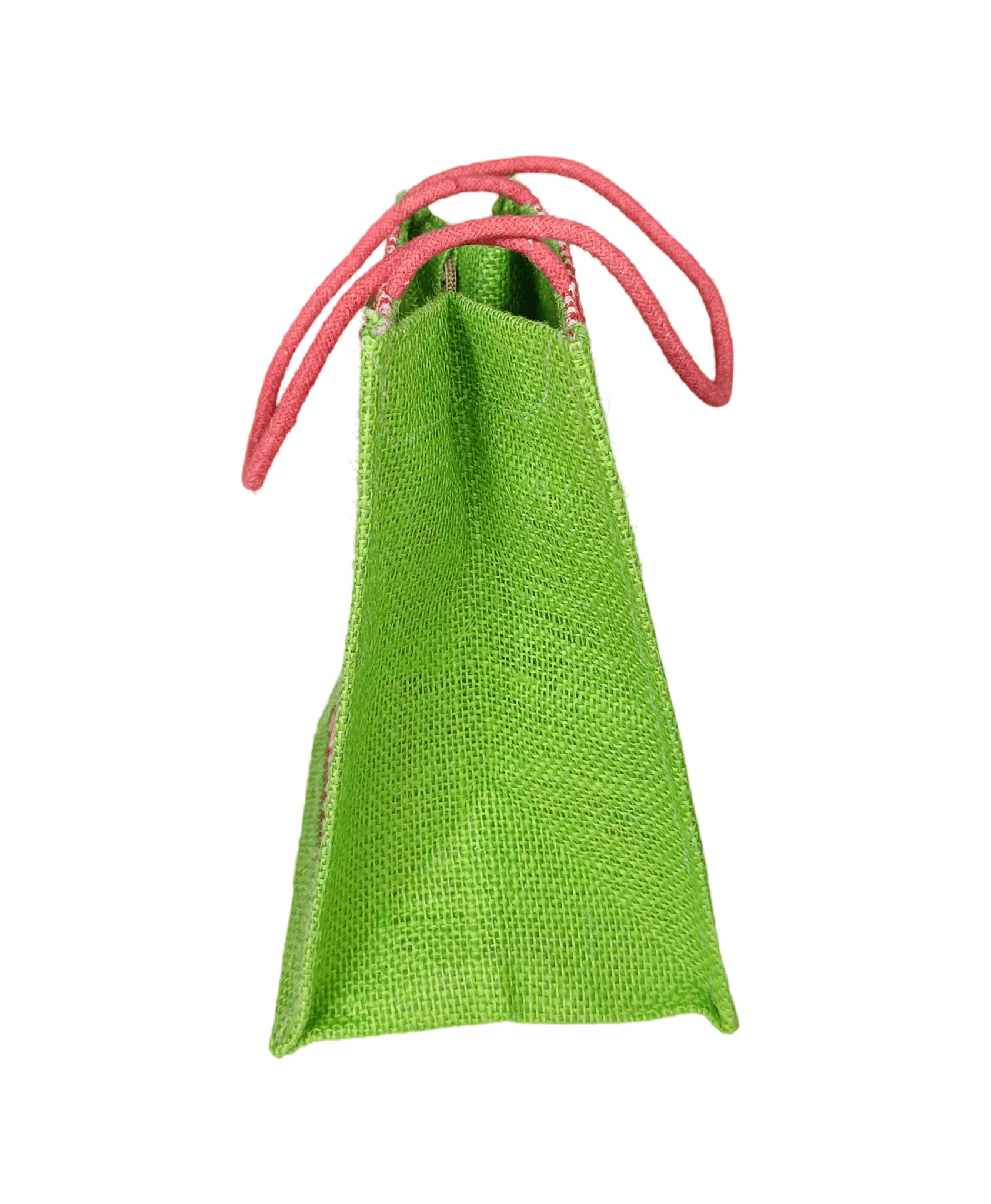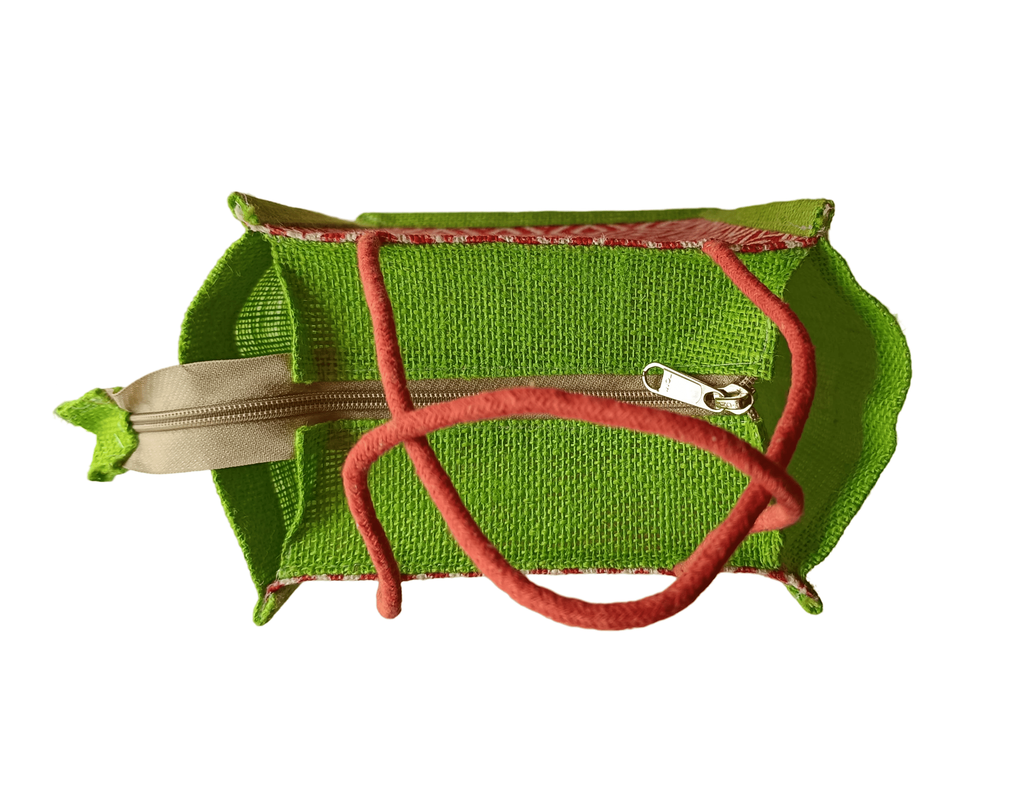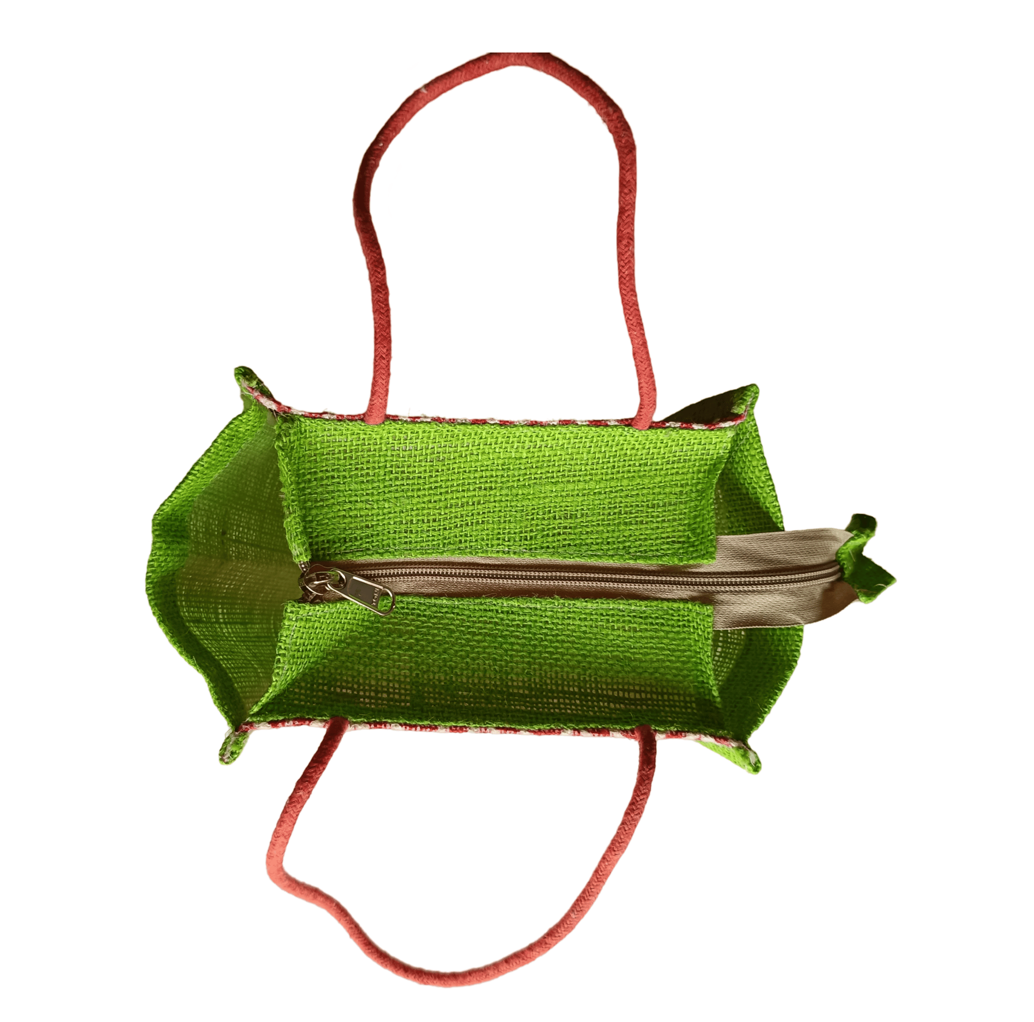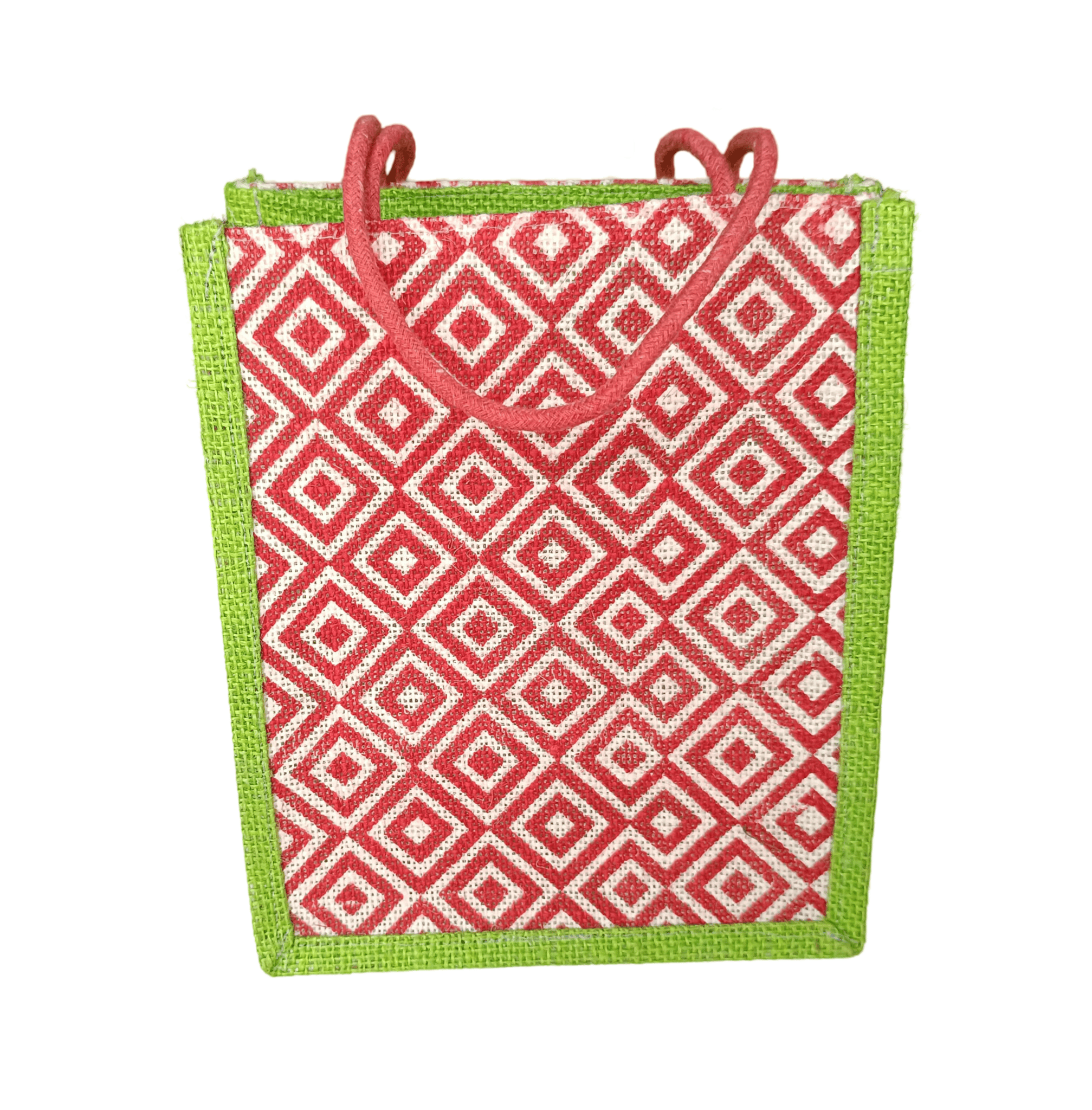 Red and White Geometric Print Jute Tote Bag with Green Trim (Small)