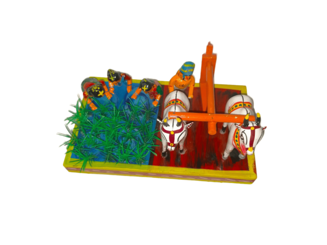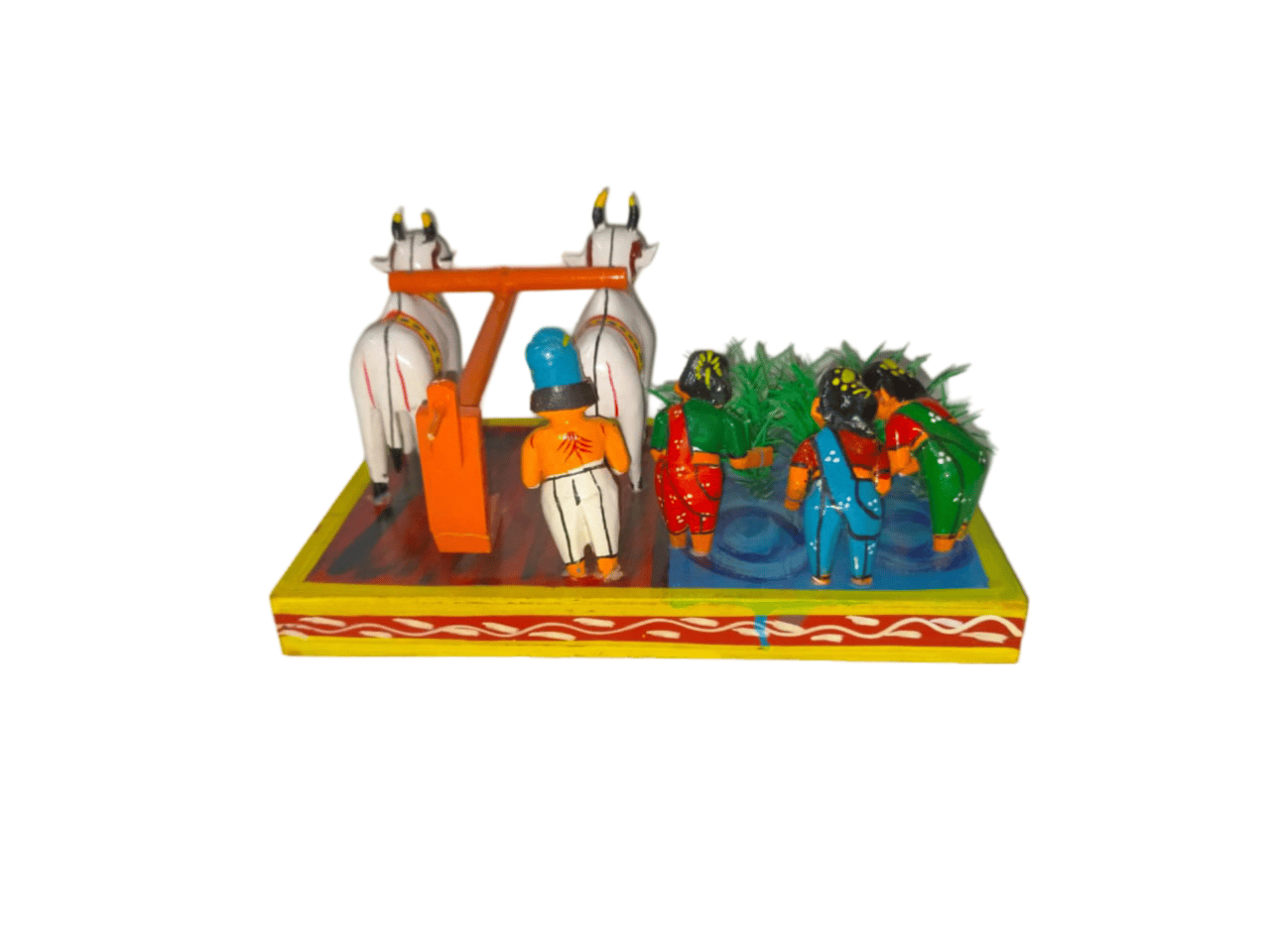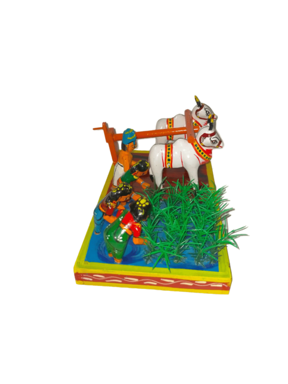 Handcrafted wooden figurine showcasing a traditional rural scene with a farmer, oxen, and women planting crops, ideal for cultural décor.
